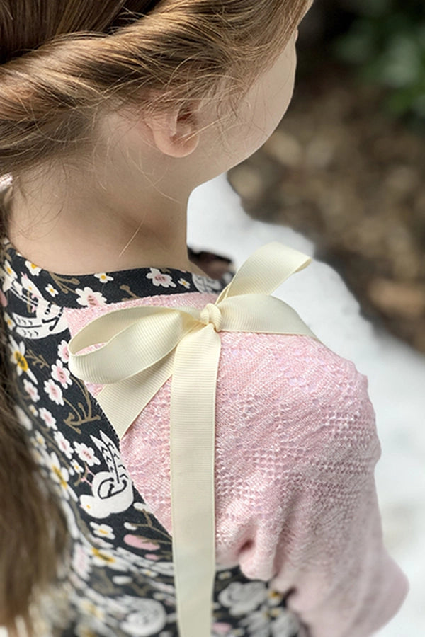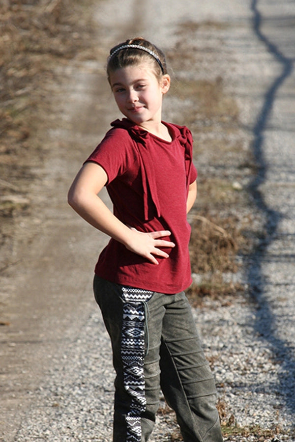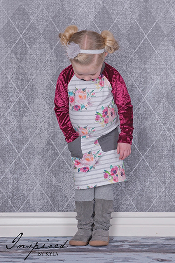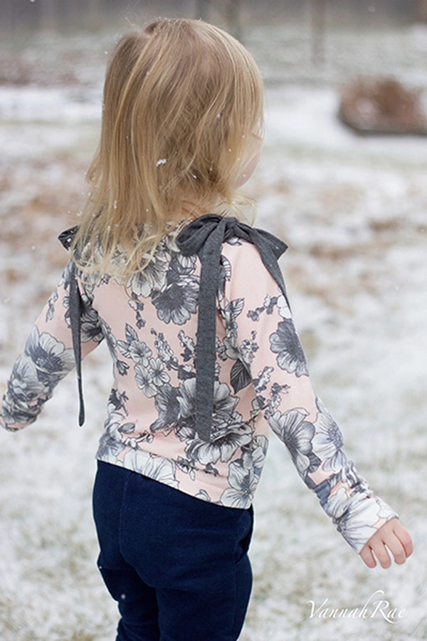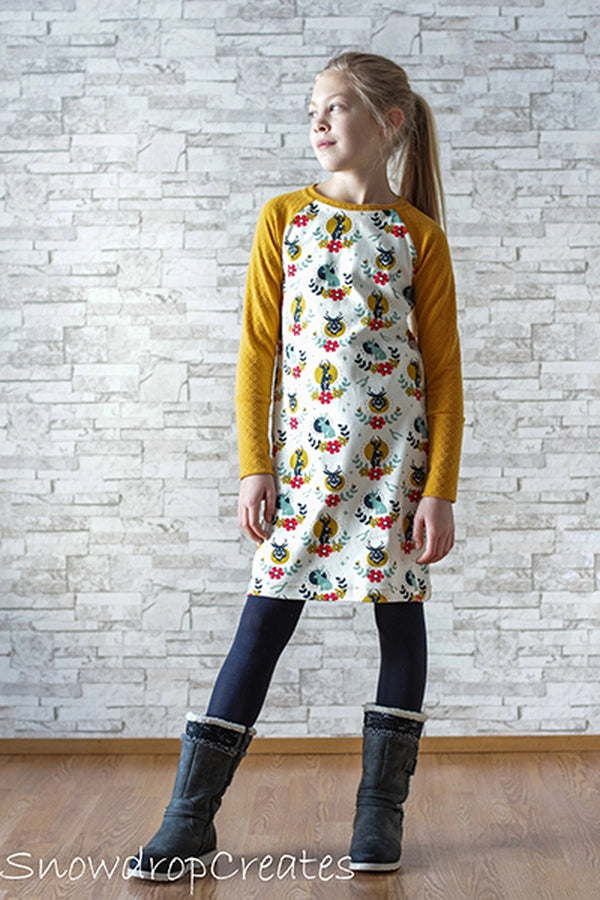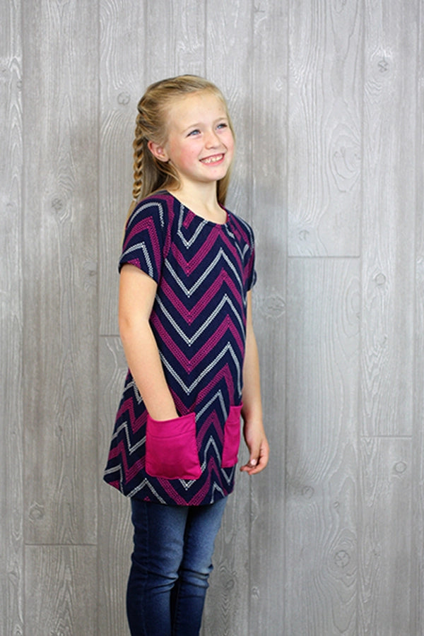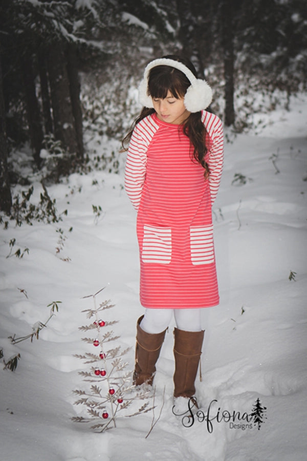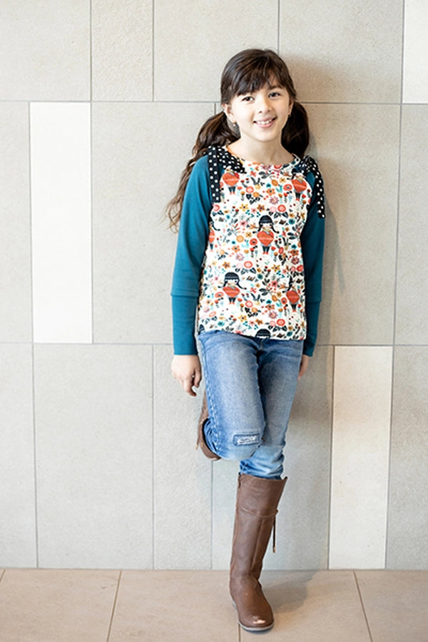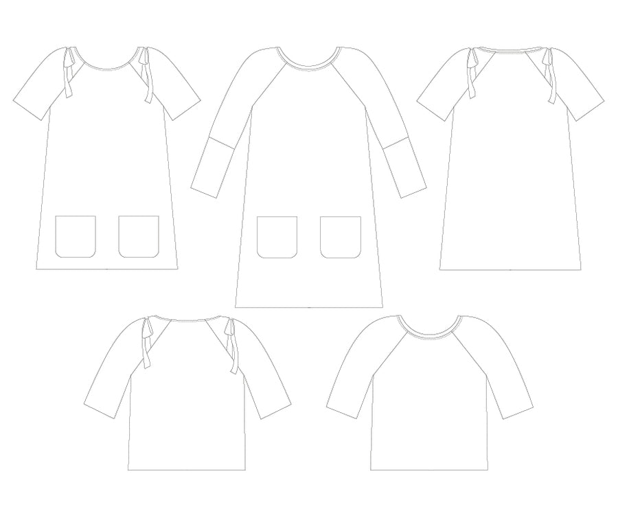 The Aurora is a semi-fitted knit raglan tee, tunic or dress that is easily sized up for a looser fit. The optional ties on the shoulders come together in a bow and look pretty with the simple neckline. Leave them off, perhaps, and keep it a bit more sporty with a banded neckline. There are three sleeve lengths. The long sleeve is created by adding a long cuff and is ideal for the colder seasons.