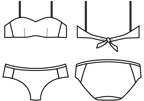 Living in a hard-to-reach area, I originally designed this bikini to use the stretch of strips of swimwear fabric - which I call "elast-ish" - rather than special elastics or other notions (although elastic is optional). The wireless top has under-bust darts, thin shoulder straps and ties at the back. The bottoms are low-rise hipsters that provide full coverage, thanks to the curved seam of the side panels. Ideal for the minimalist who cannot choose, the reversibility gives you four different wearable combinations and plenty of opportunity for color-blocking. (The pattern comes with bonus tips on creating panties with the bikini bottoms pattern!)