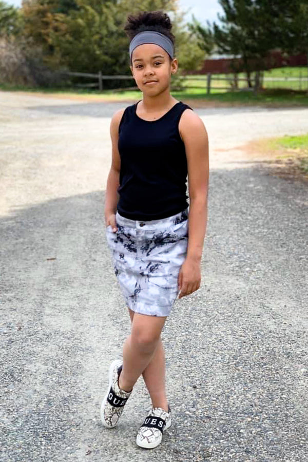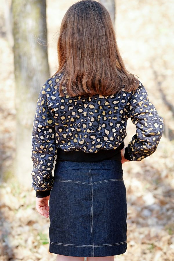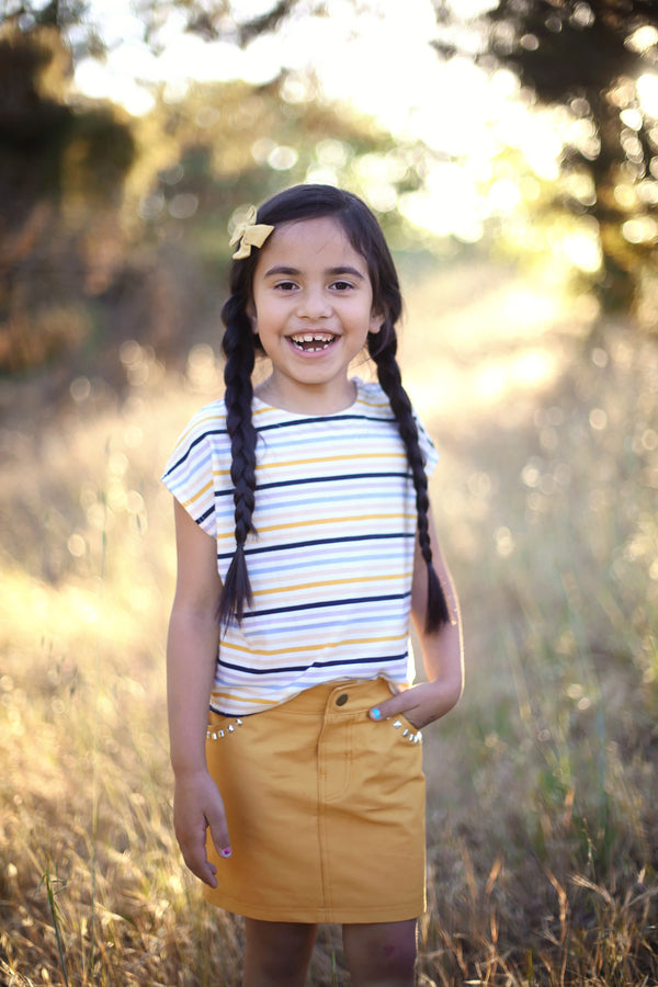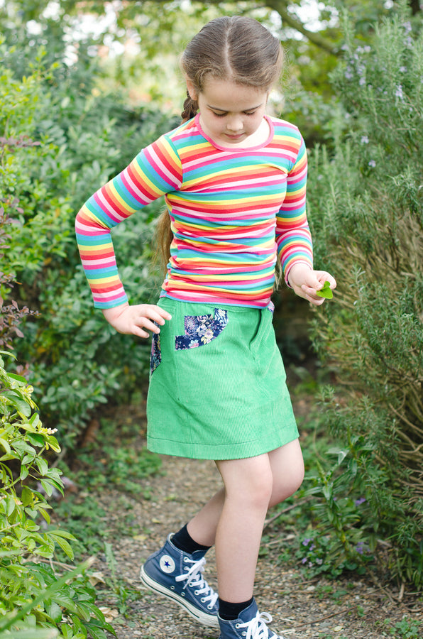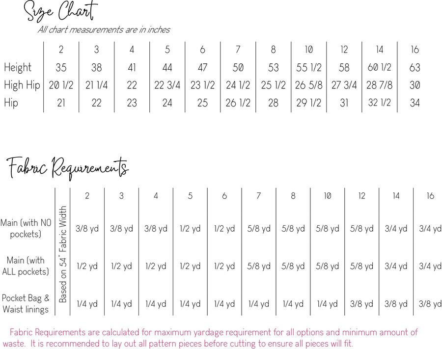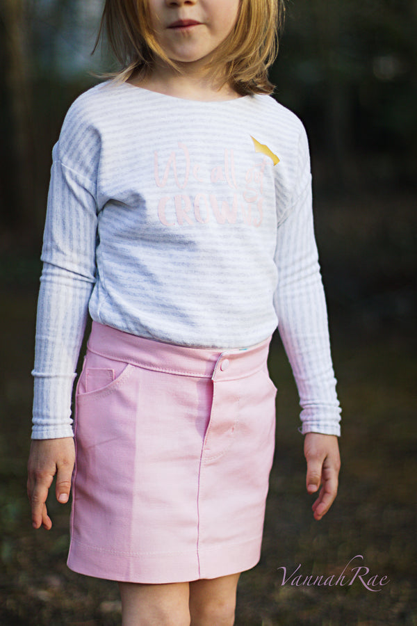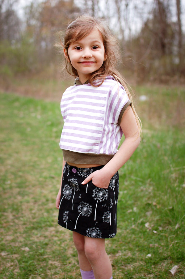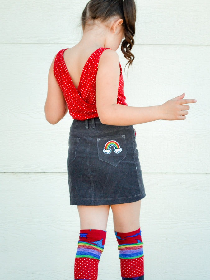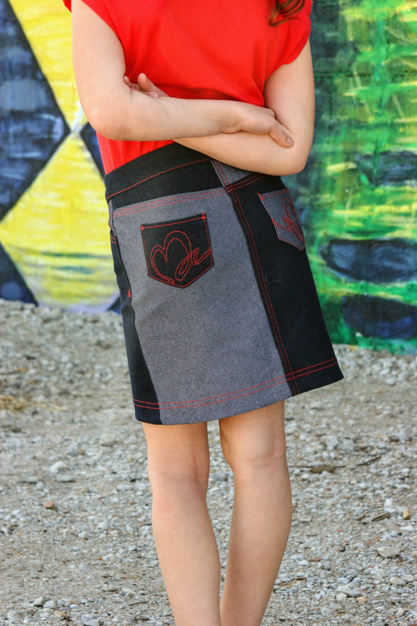 The Bedrock Skirt is a typical jean skirt style garment that looks great in many bottom weight fabrics such as denim, twill, and corduroy. Back, front and coin pockets are all optional so choose to include as many or as few as you like. An optional raw-edged pocket detail also curves along the front pocket opening to give some added interest. The front of the skirt features a faux fly for sizes 2-6 and a zipper fly for sizes 7-16. The waistband can then include either a snap or button closure above that. Optional belt loops give the finishing touch to really make this skirt remind you of your favourite jeans.