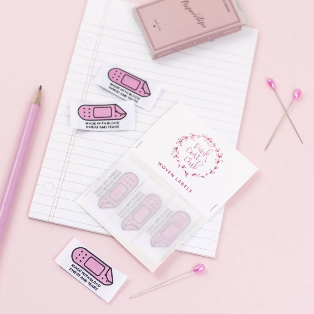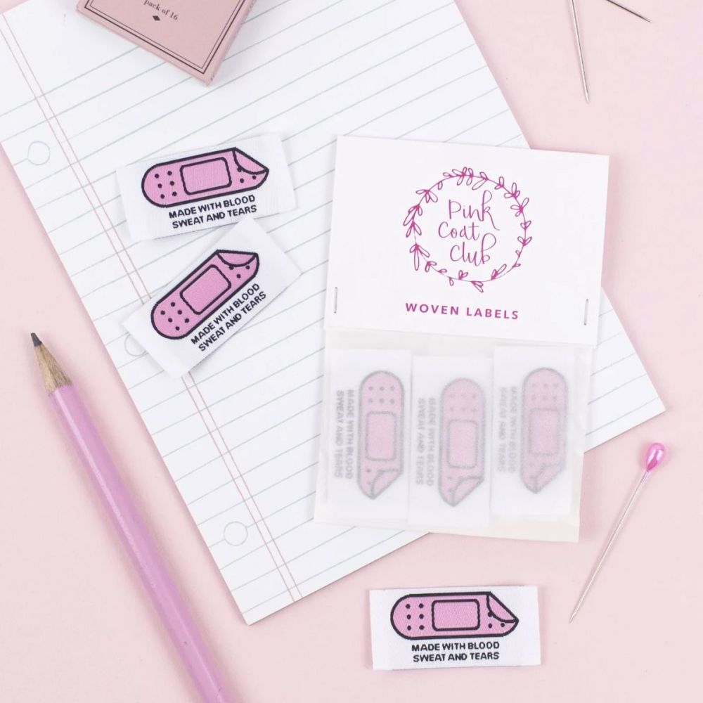 Labels feature a pink plaster (band aid) and black text on a white background.