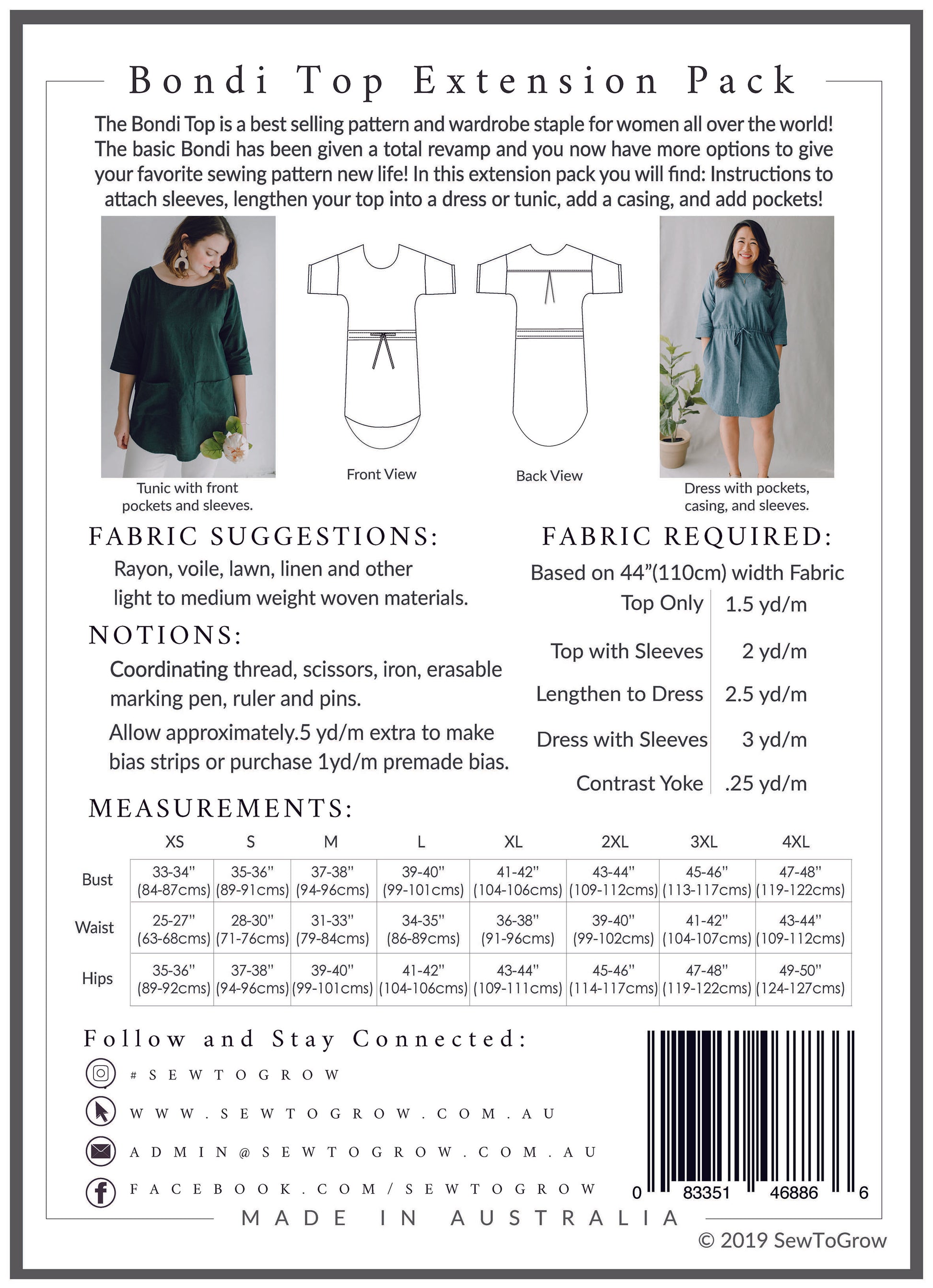 The Bondi Top is a best selling pattern and wardrobe staple for women all over the world! The basic Bondi has been given a total revamp and you now have more options to give your favorite sewing pattern new life! In this extension pack you will find: Instructions to attach sleeves, lengthen your top into a dress or tunic, add a casing, and add pockets!