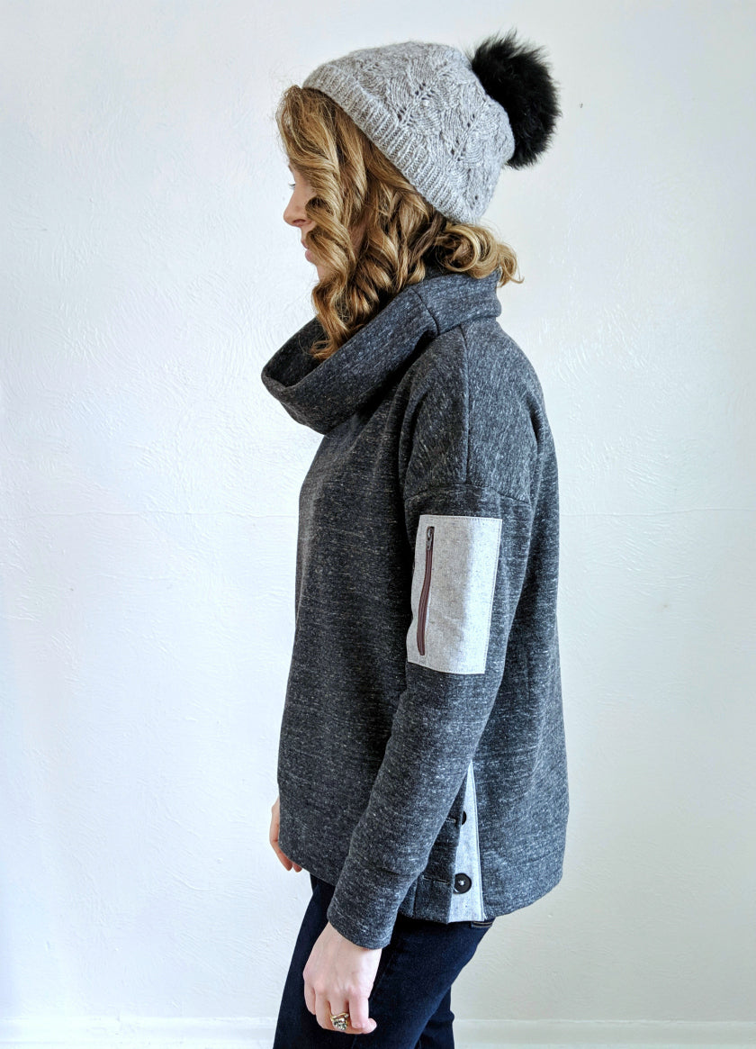 The Brunswick is perfect for fall or winter paired over jeans and boots or for a great workout layering piece with leggings and sneakers. The plackets and pocket provide a fun opportunity to feature a contrasting or textured woven fabric. The buttons or snaps on view A also provide unique character to this pullover. View B can be made very simply with no extra features, making it perfect for beginners!