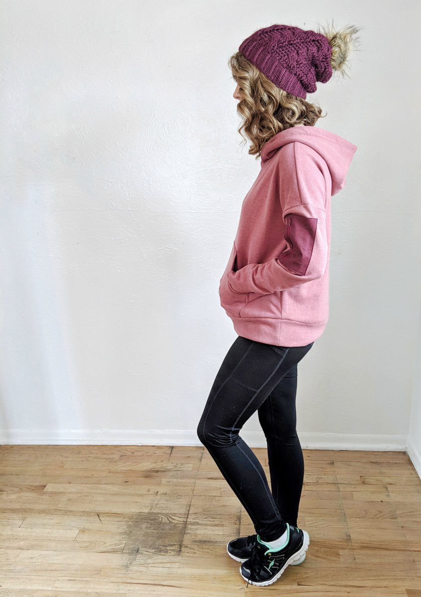 The sleeve pocket, hood, and cowl are interchangeable for each view. The kangaroo pocket can be used on either view but is only suggested for view B. Both views also feature a cropped version, as seen in the rose coloured hoodie in these product photographs.