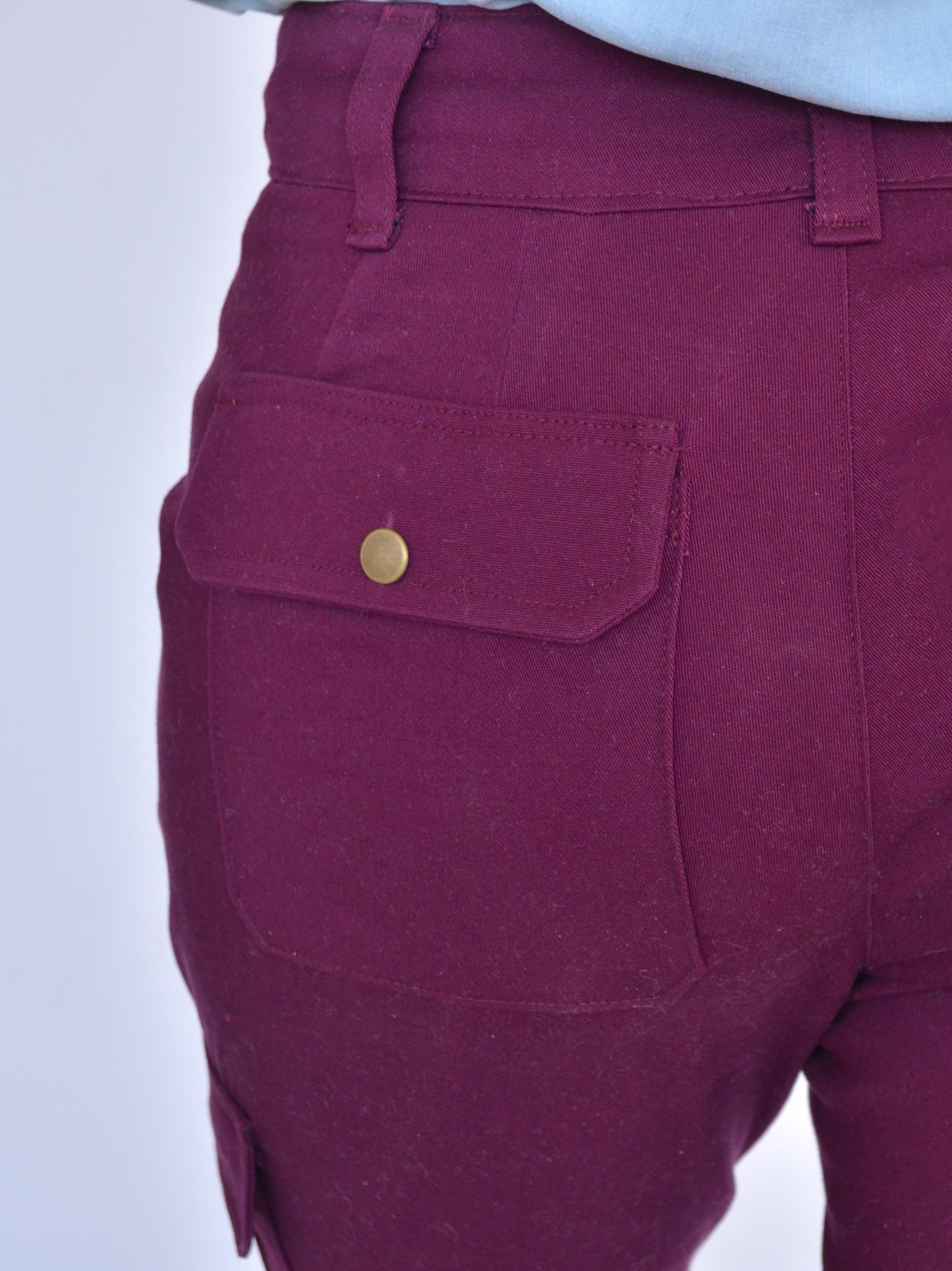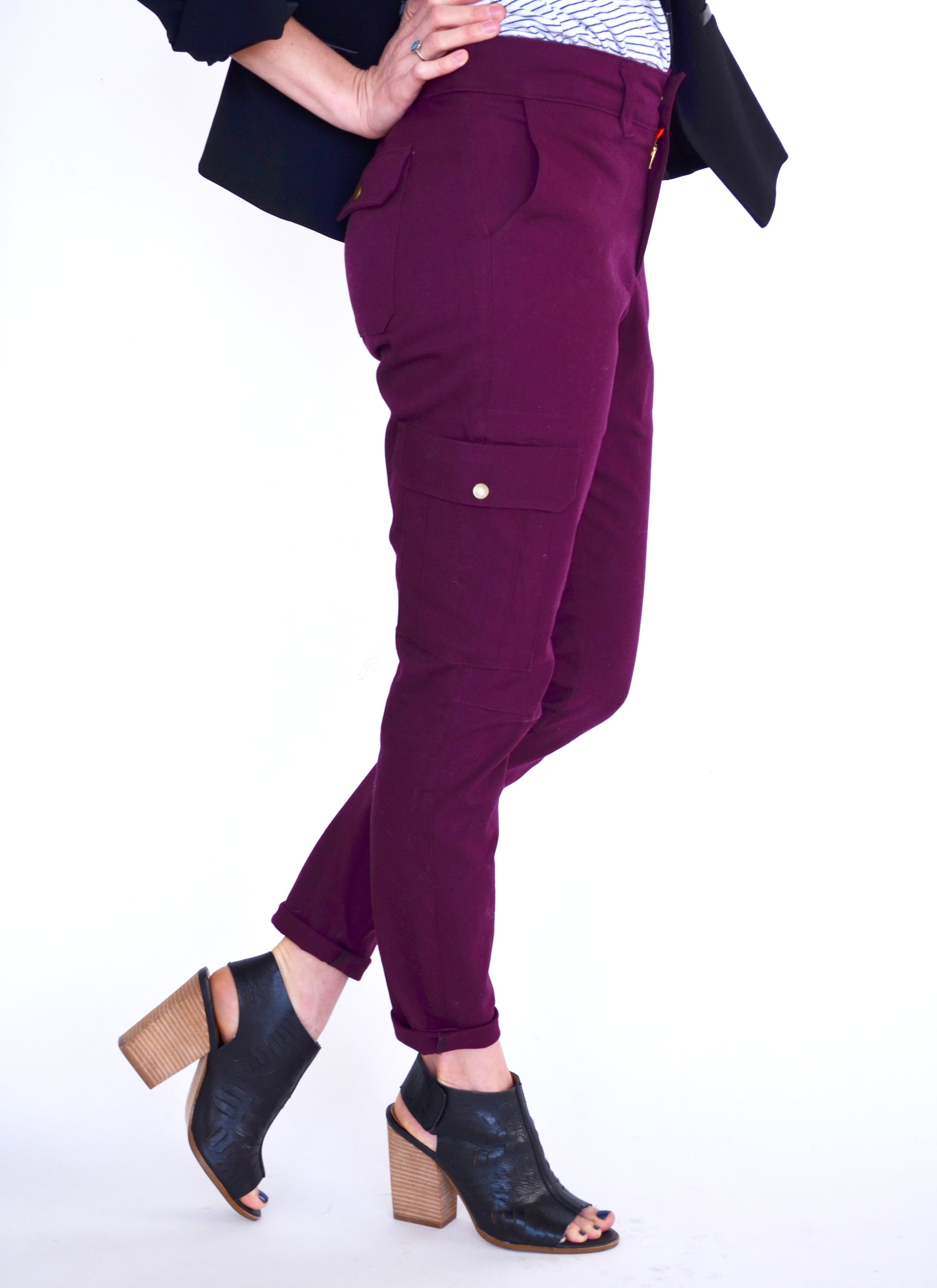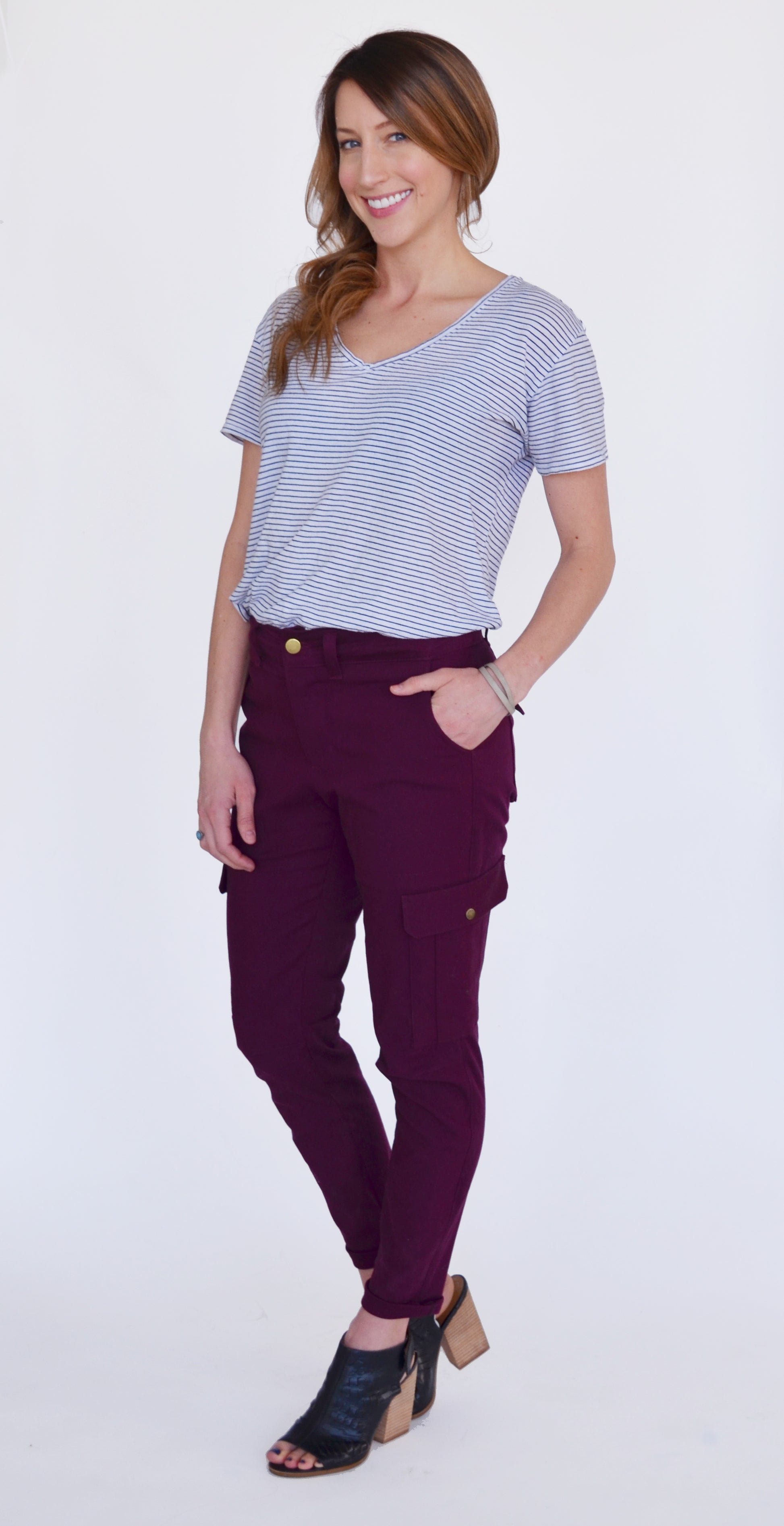 The Bryce Cargo Pants are mid-rise, slim fit, ankle length pants. They feature traditional pleated cargo pockets above the knee with pocket flaps, deep slash hip pockets with seam-outlined bags, back flap pockets, and darts at the knee for extra shaping and detailing.