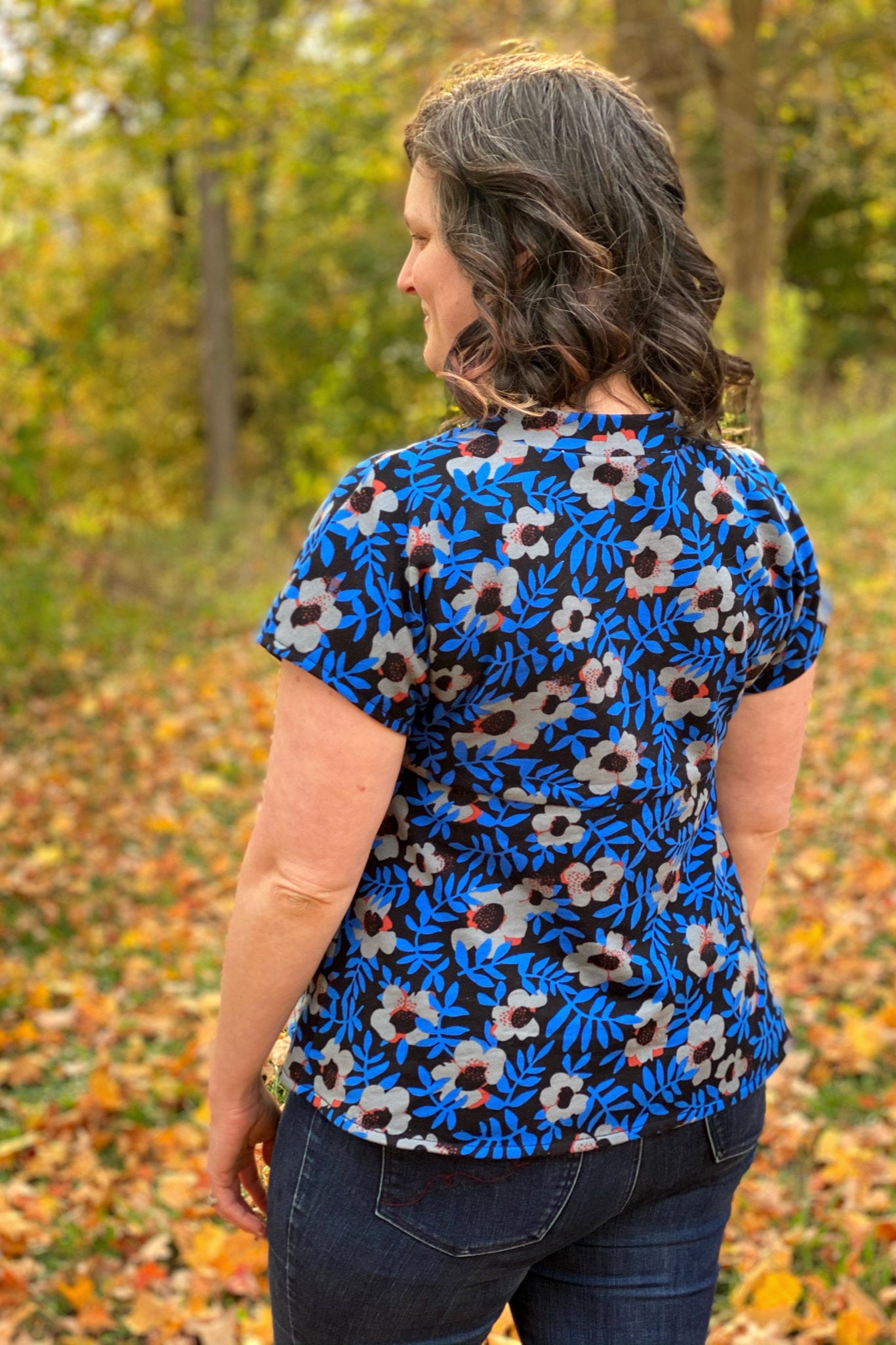 Pattern details include relaxed shoulders, underbust seam, vertical bust darts and cuffed sleeves.