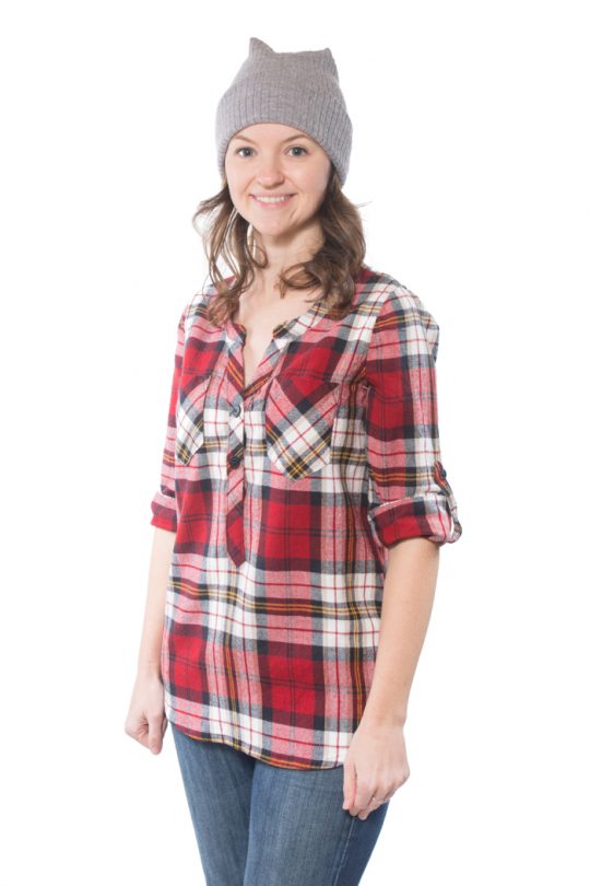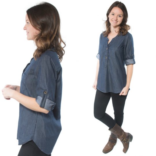 A casual woven shirt or tunic in two views. View A is a standard collared button down, perfect for making a cozy flannel or trendy chambray shirt. View B has a dropped neckline with no collar and a shaped half placket. Both views feature full or 3/4 length sleeves with optional sleeve tabs and pockets and shirt or tunic lengths.