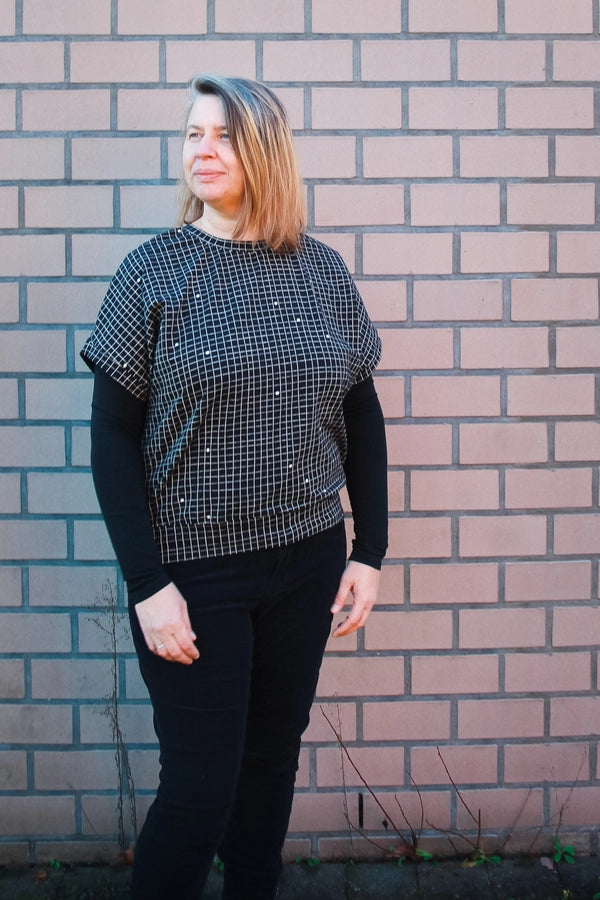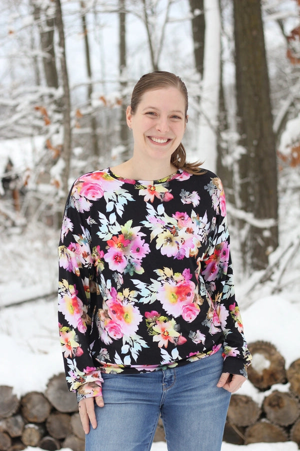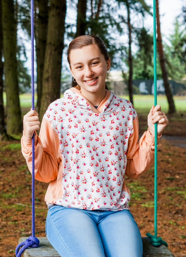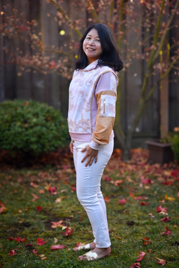 Miss Clover is a dropped shoulder knit hoodie in high or low waist lengths. The style lines are slightly reminiscent of the 80’s (and I’m well acquainted with those years). Choose to use the curved style lines or keep the whole thing simple without piecing. The long sleeve is cinched in at the wrist with a cuff to match the cuffing both at the waist hem and around the hood opening. An optional zippered pocket can be added for a sporty touch. The sleeveless option still appears to have a “short sleeve” making this a great pattern for all temperatures.