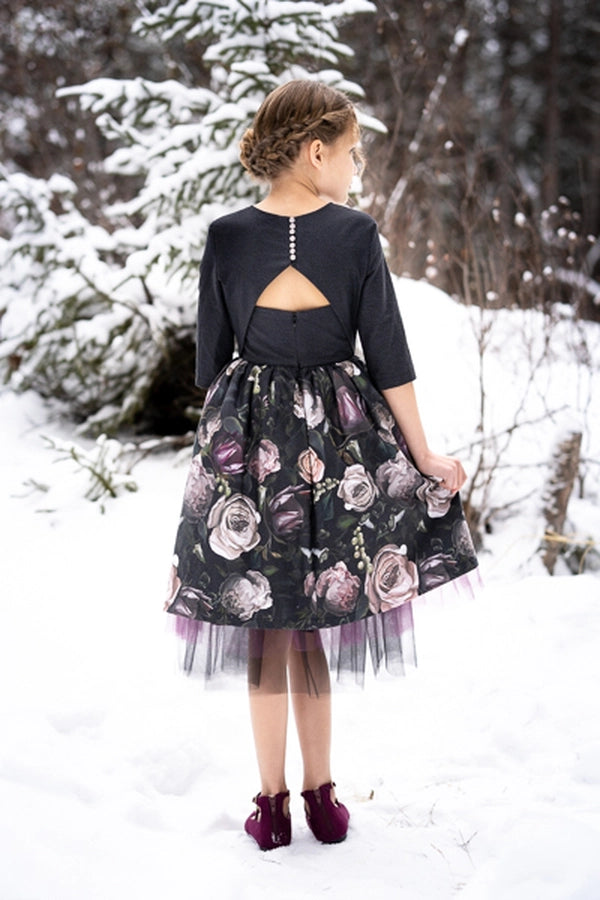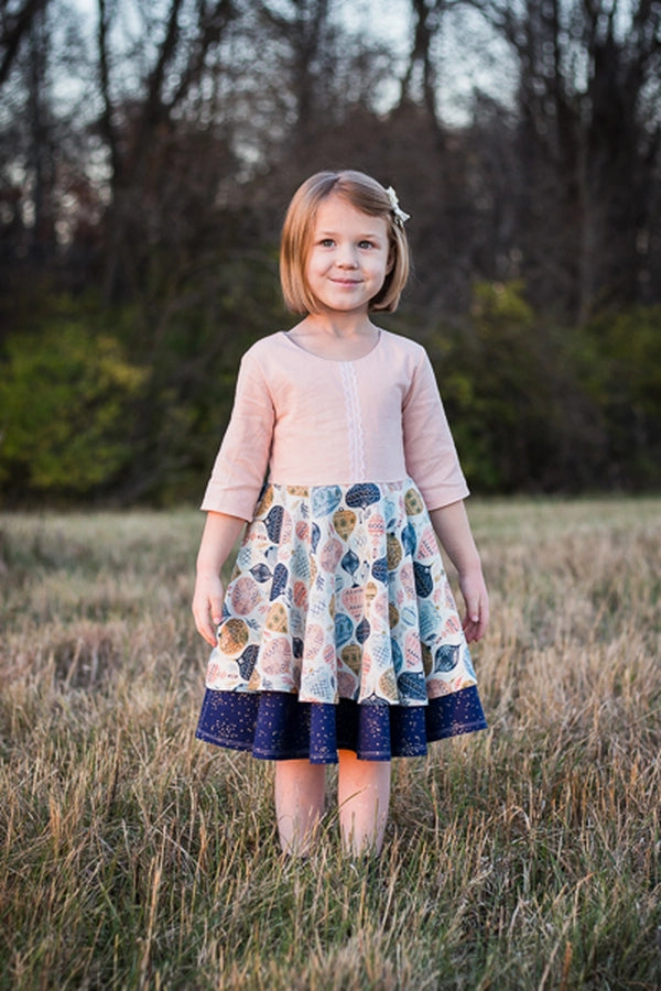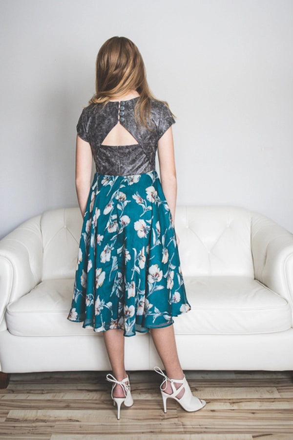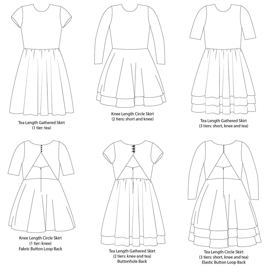 The Cranberry Dress is a single to multi-tiered dress made with either gathered or circle skirt(s). Three layers include short, knee and tea length. Combine your choice of the layers to create a single, double or triple layer skirt. Cap, elbow or full length sleeves mean this dress can work in all seasons. The lower back closes with an elegant invisible zip, while the upper back features 3 different button options: elastic button loop tape with delicate buttons, handmade fabric button loops with 1/2” buttons, or buttonholes with larger feature buttons.