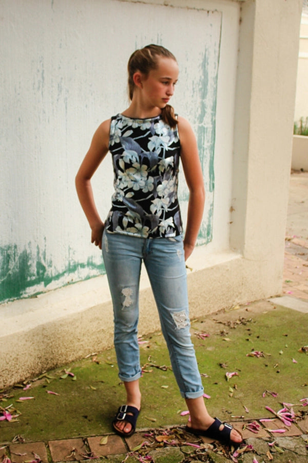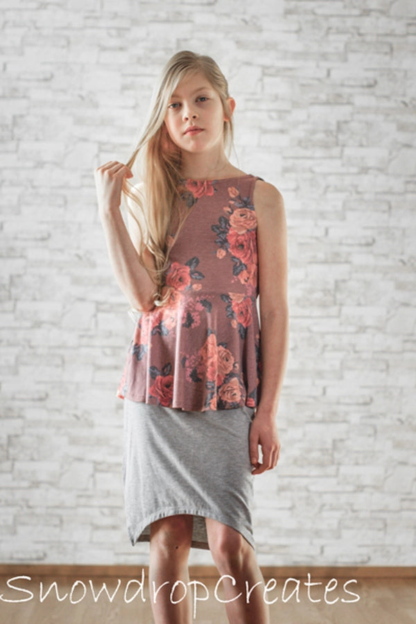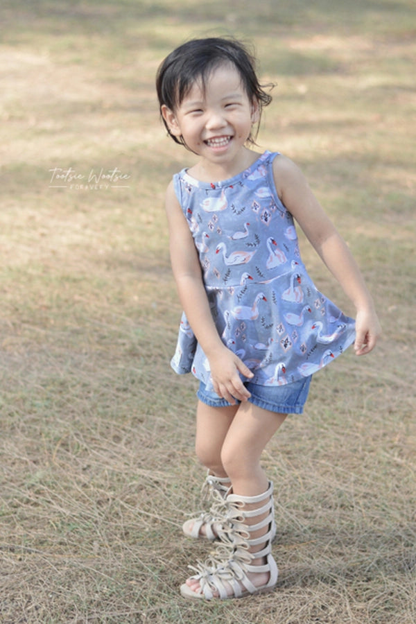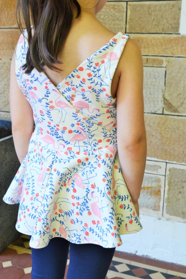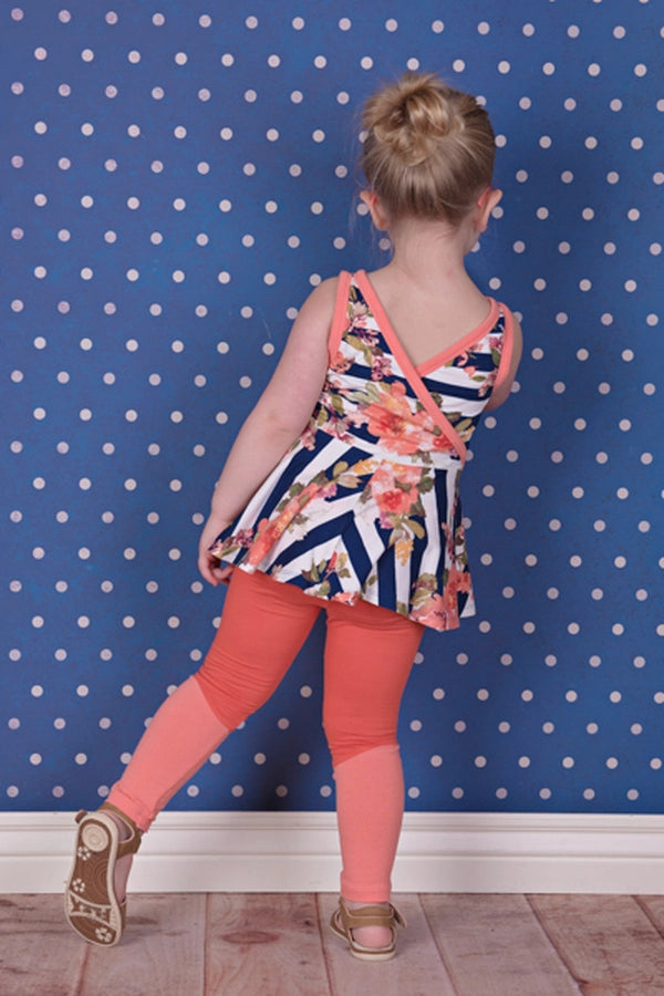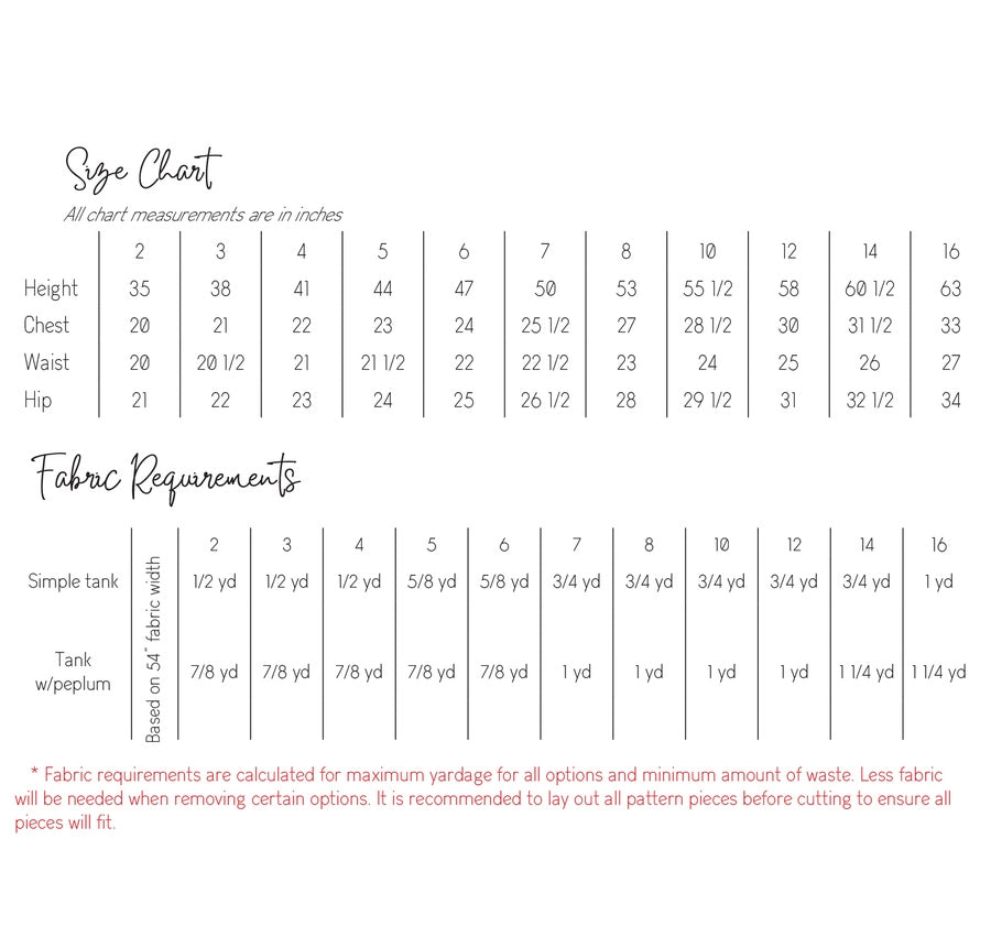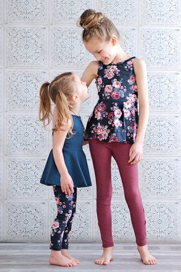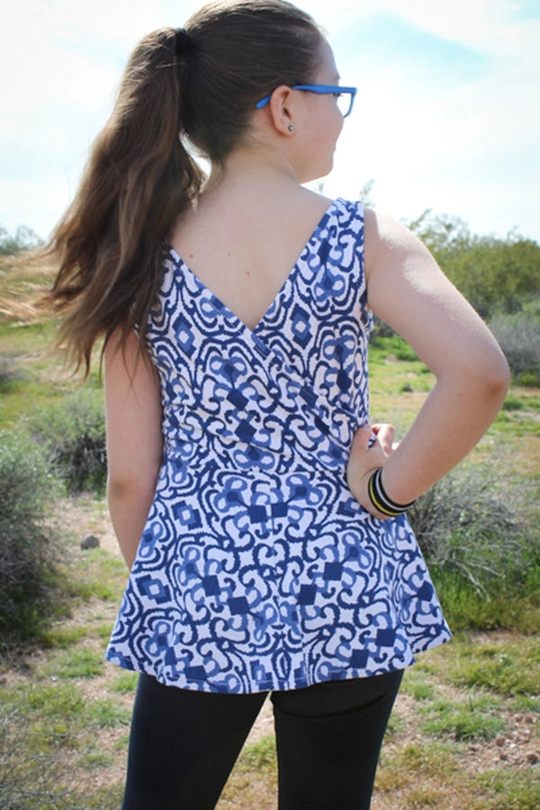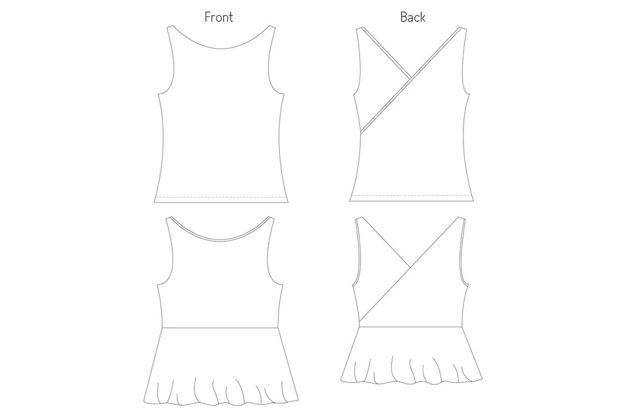 The Dandelion is a cute, basic, summer tank top. It features a criss-cross back finished with hidden facings. Flipping the facing to the right side gives a decorative feature. Make a simple tank or a super cute 3/4 circle peplum tank with 2 lengths to choose from. This top pairs nicely with the Rocky Shore tights for an easy play date outfit. Or the Pinecone skirt!