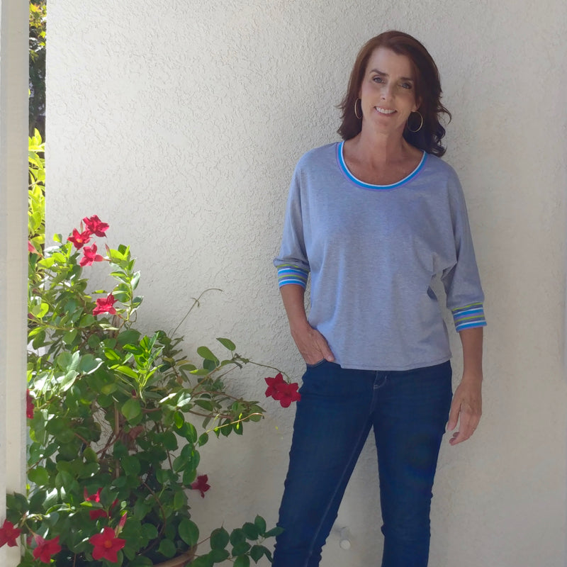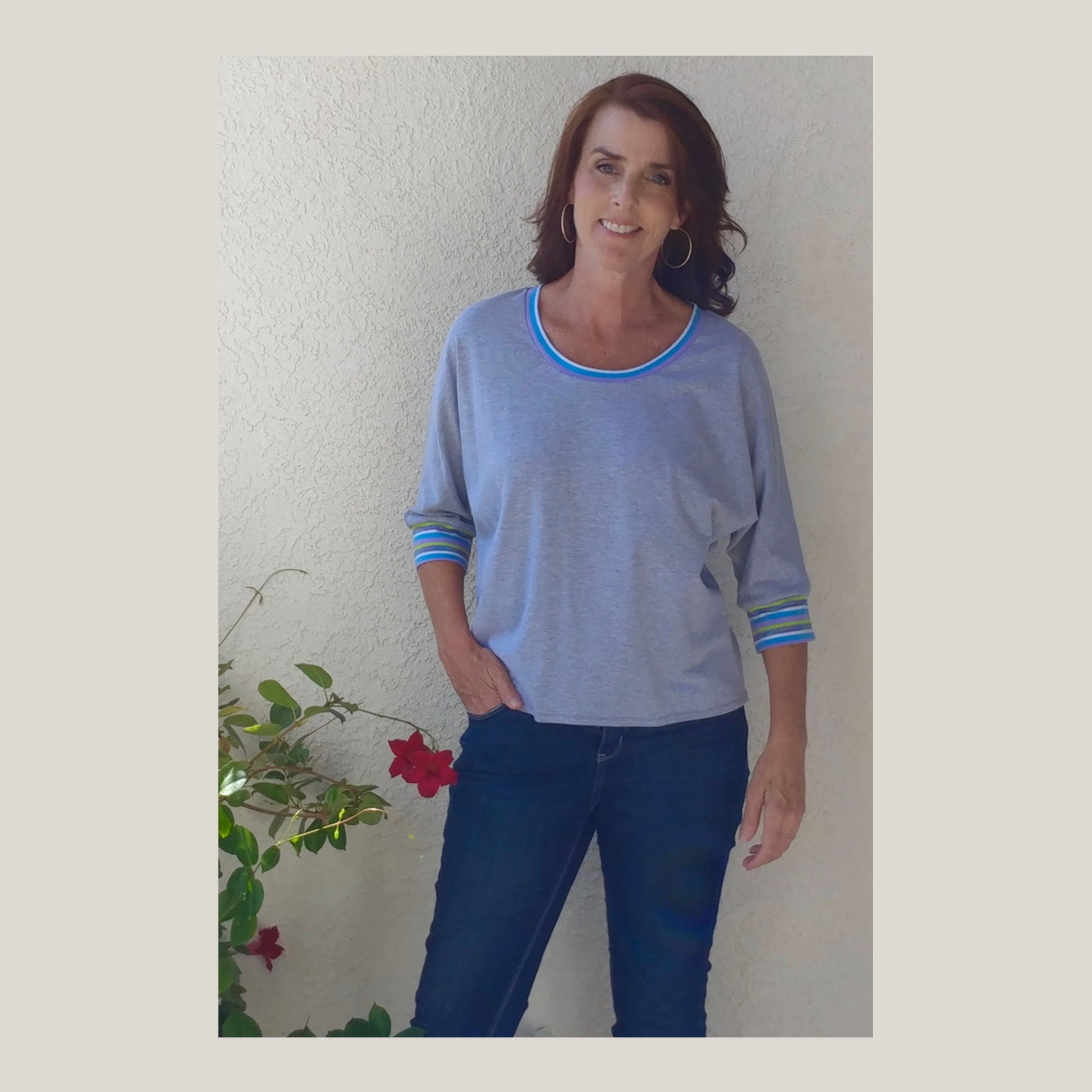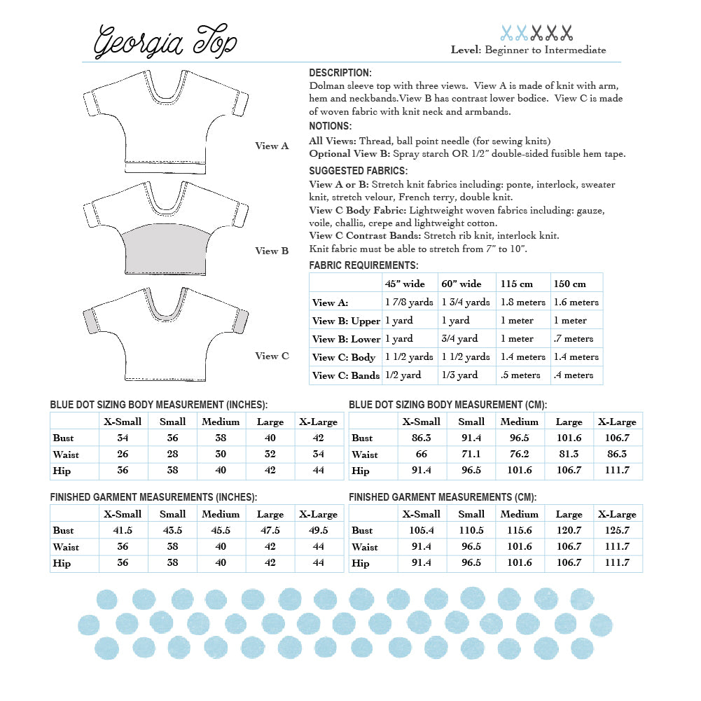 The Georgia Top, is a women's dolman sleeve top in three views for beginner to intermediate sewists. View A is made of knit with arm, hem and neckbands. View B has contrast lower bodice. View C is made of woven fabric with knit neck and armbands.