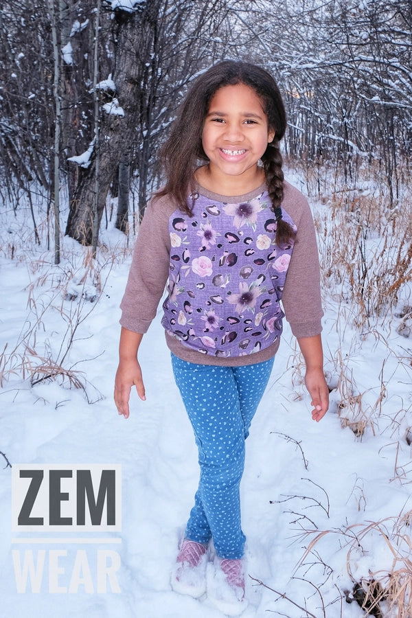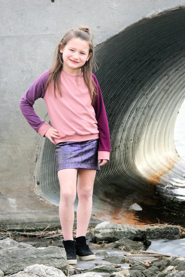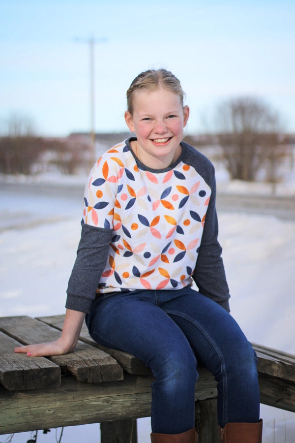 This semi-fitted top combines raglan and dolman sleeves in one pattern. Use the pattern to create a regular raglan top, dolman top, or a combo with one of each sleeve. Sleeve options include a long sleeve with wide cuff meant to come up over the bottom of the hand or a 3/4 length sleeve meant to be pushed up for a relaxed, comfy look. This is a very quick sew that can be accented with unique arm details. Wear with a pair of Tamarack tights or Trail joggers.