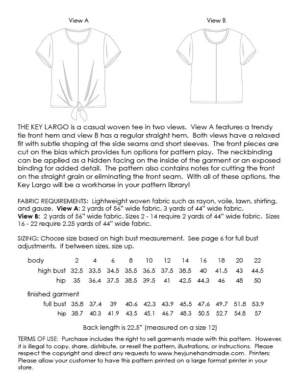 THE KEY LARGO is a casual woven tee in two views. View A features a trendy tie front hem and view B has a regular straight hem. Both views have a relaxed fit with subtle shaping at the side seams and short sleeves. The front pieces are cut on the bias which provides fun options for pattern play.