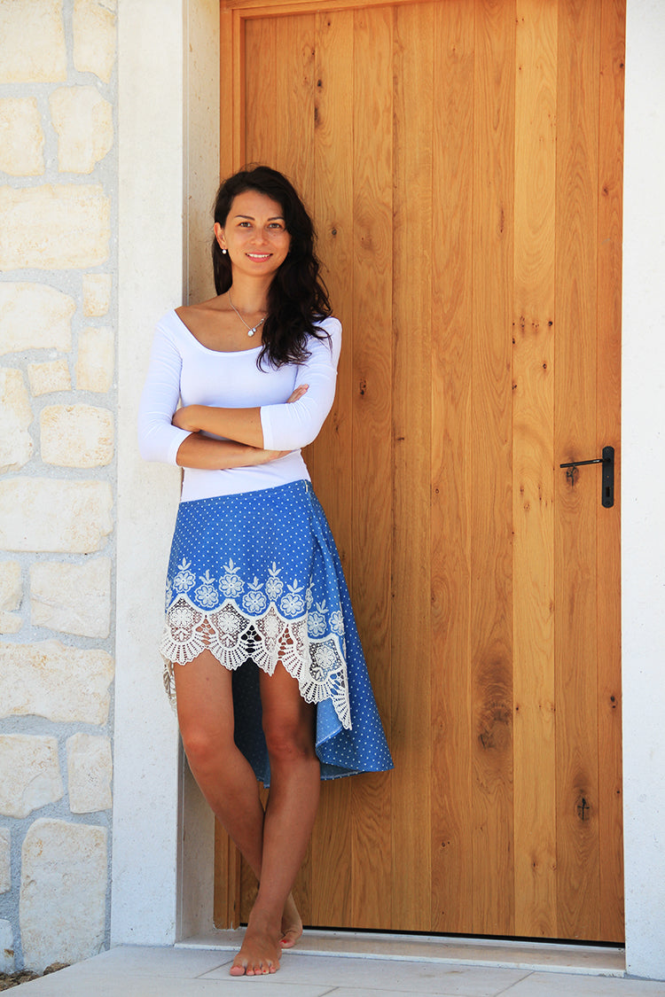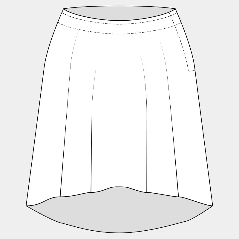 A high low skirt with an asymmetrical hem (the front edge is shorter than the back) The waist is finished with an elegant facing and the skirt fastens at the side with a hidden zipper.