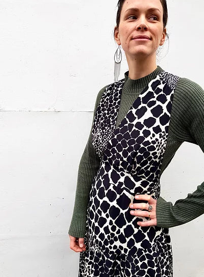 The Lynn Pinafore and Skirts pattern gives you a dress and two skirts all in one pattern. All three styles feature an asymmetric skirt with a split over one leg, gathered seams and asymmetric hemline. You can choose to make the skirt with a flat or an elasticated waistband. The dress has softly gathered front bodice pieces added to it and crossed back straps.