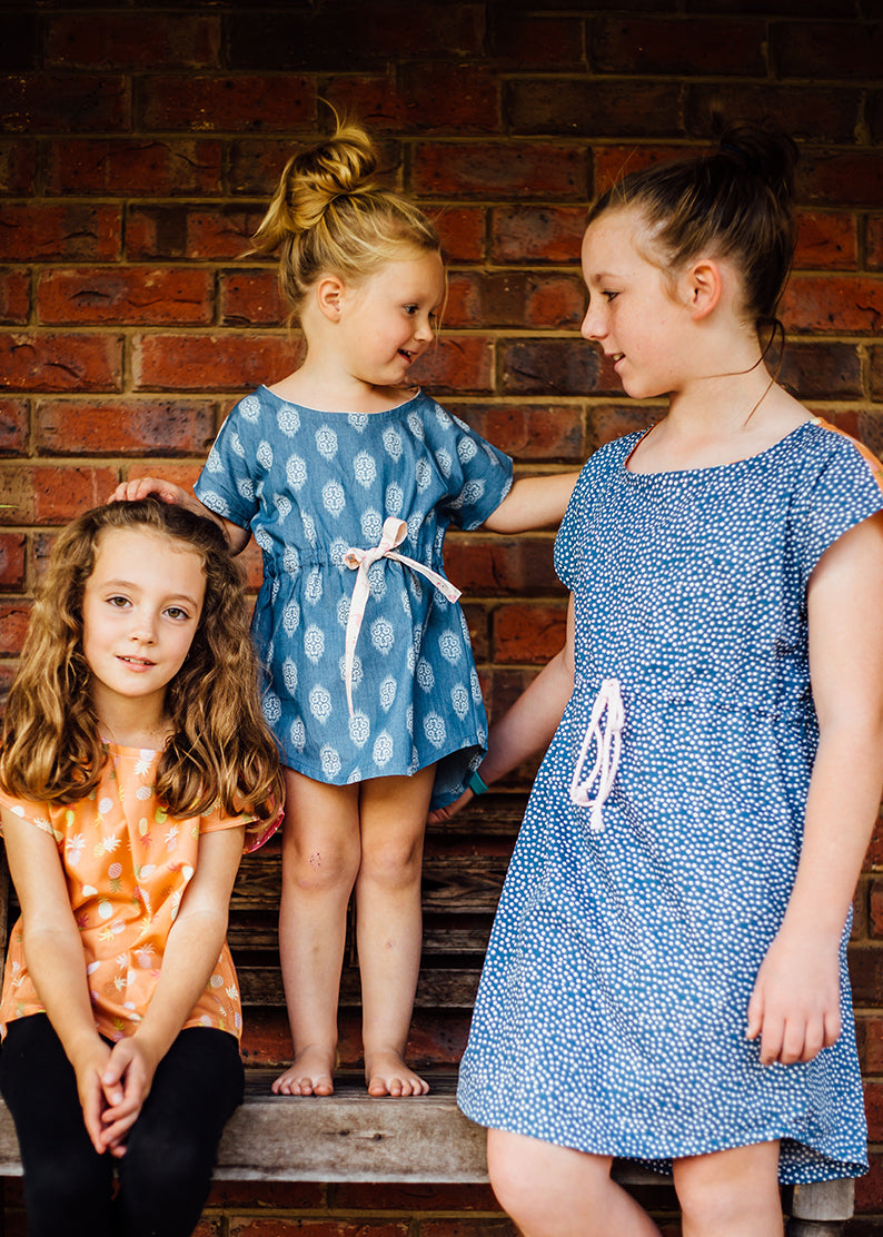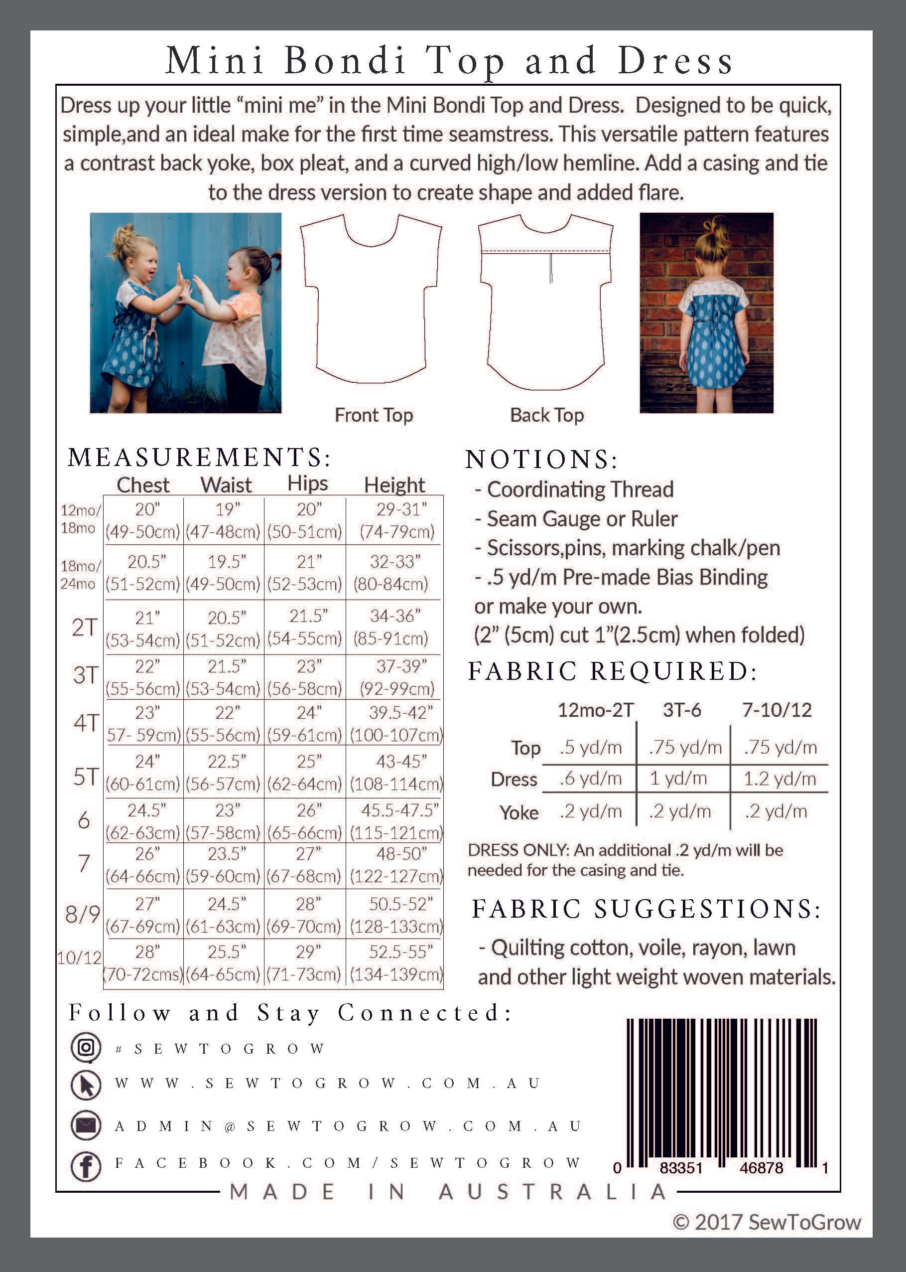 Dress up your little "mini me" in the Mini Bondi Top and Dress. Designed to be quick, simple and an ideal make for the first time seamstress. This versatile pattern features a contrast back yoke, box pleat, and a curved high/low hemline. Add a casing and tie to the dress version to create shape and added flare.