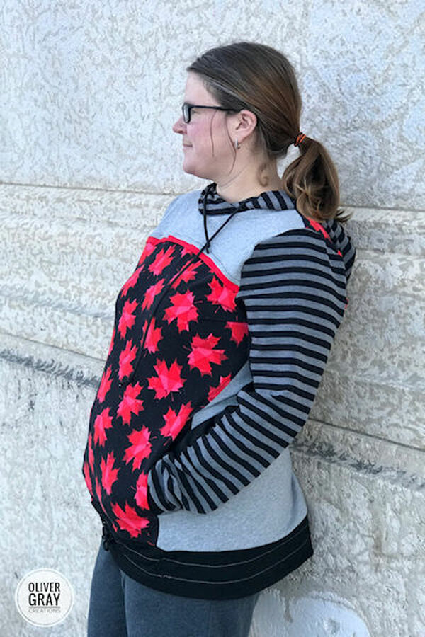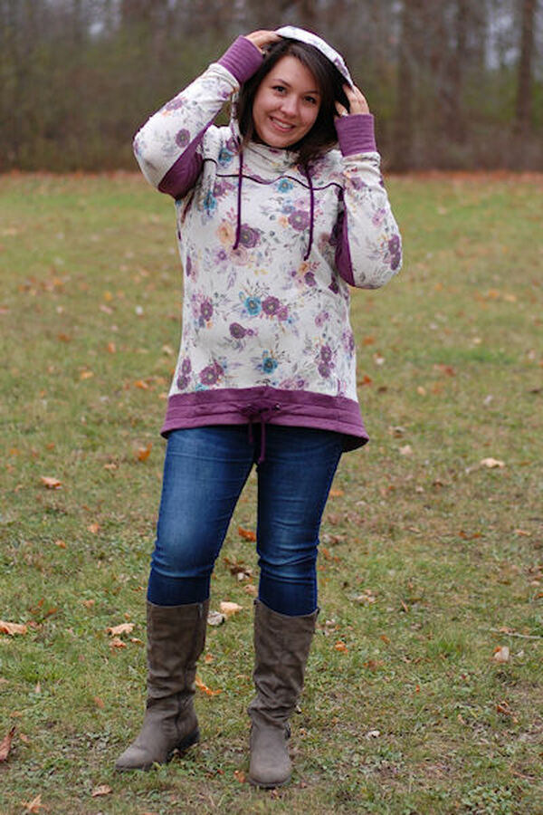 The Miss Bonfire hoodie from our junior miss collection is designed with a cozy, slightly relaxed fit that nips in a bit at the waist for shaping. Separate front bodice/panel pieces are available for A-D cup sizes. A lined hood with an optional drawstring is a main feature of this sweater, but it CAN be made with just a simple neckband instead. The sleeve cuffs can be made as either solid cuffs or with a thumb hole. The angled front panel can hide an optional front pocket. A slight hi-lo hemline makes this a perfect sweater for pairing with leggings.