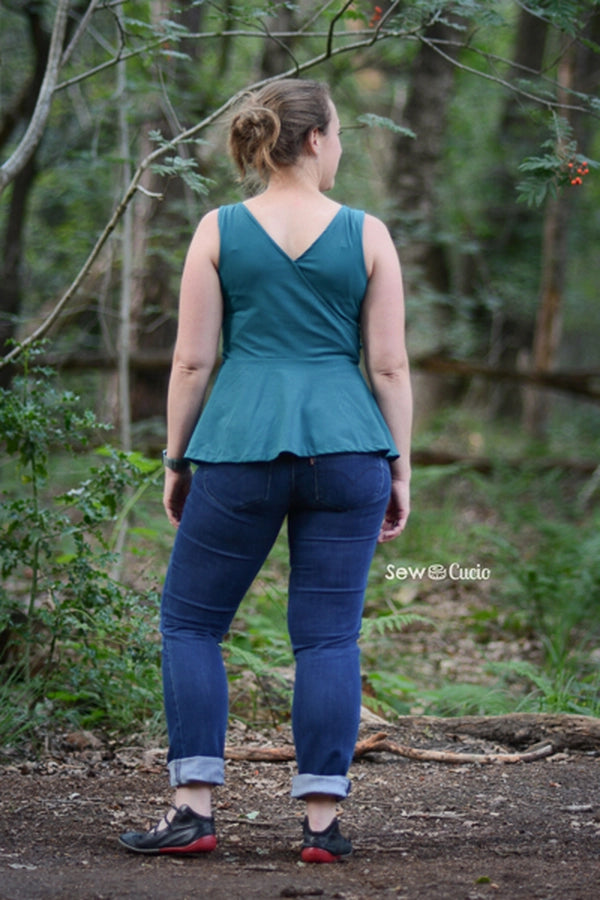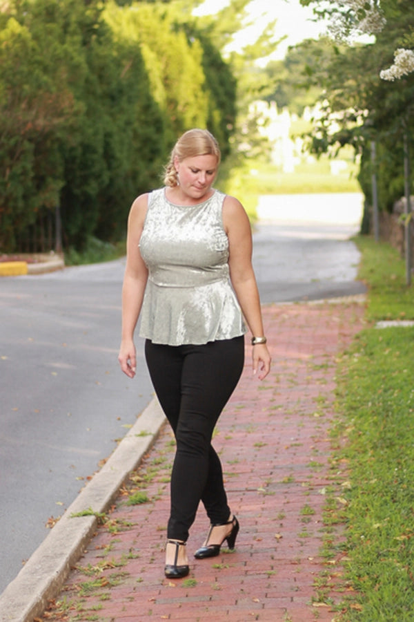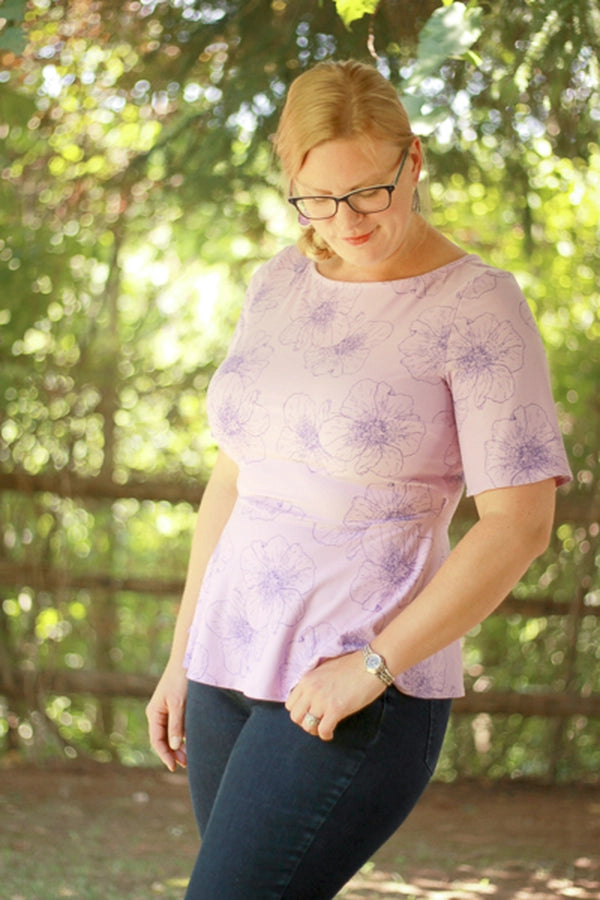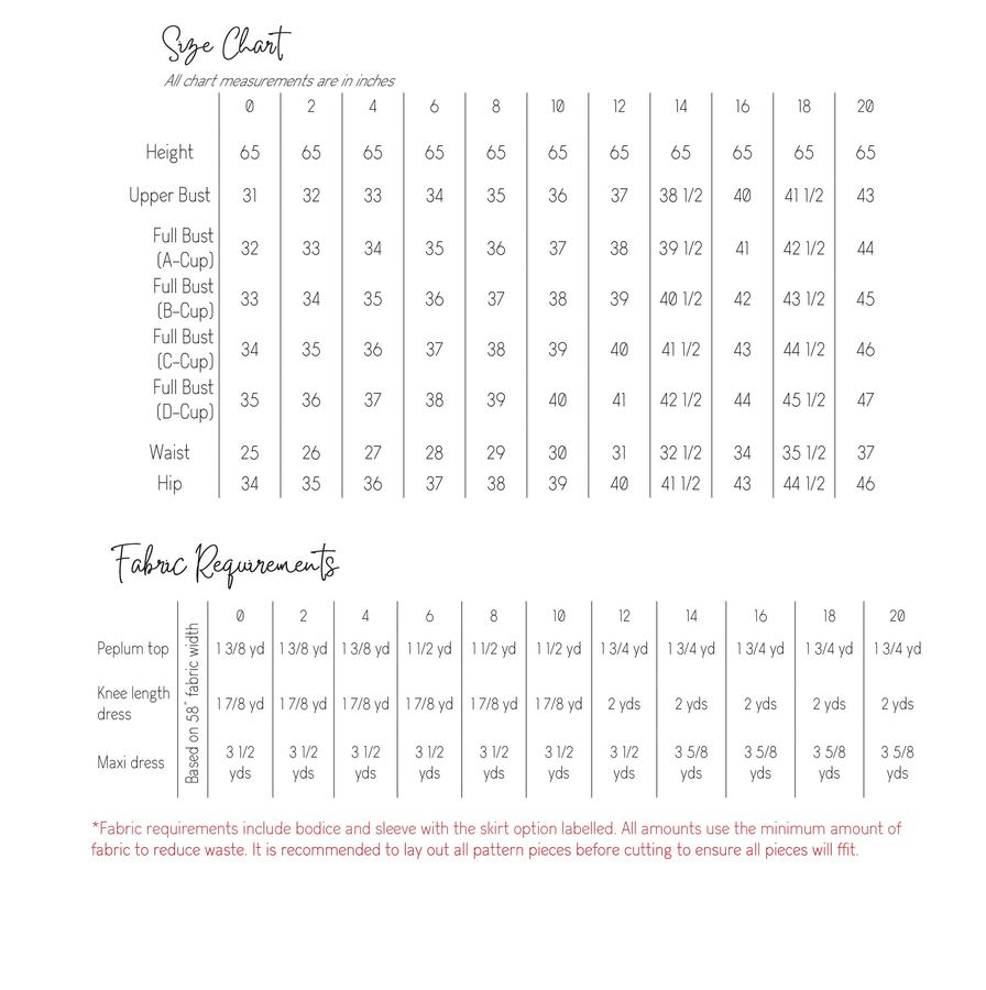 Miss Dandelion is a knit pattern re-drafted for our junior miss size range with a few added options. The neckline is a boatneck shape and the bodice is darted for a structured look. Pattern includes 4 cup sizes, A thru D. The back criss crosses over itself for a good amount of coverage and sufficient space to climb in and pull on when paired with the Miss Aspen Add-on. The neckline and armscyes (tank version) are finished using visible or hidden facings and this size range has an added sleeve!! For the bottom, choose from a 1/2 circle peplum top or knee length dress or a 1/4 circle maxi length dress. It is SO elegant in a stretch velvet. And, of course, pair with the Miss Aspen Add-on to make a romper.