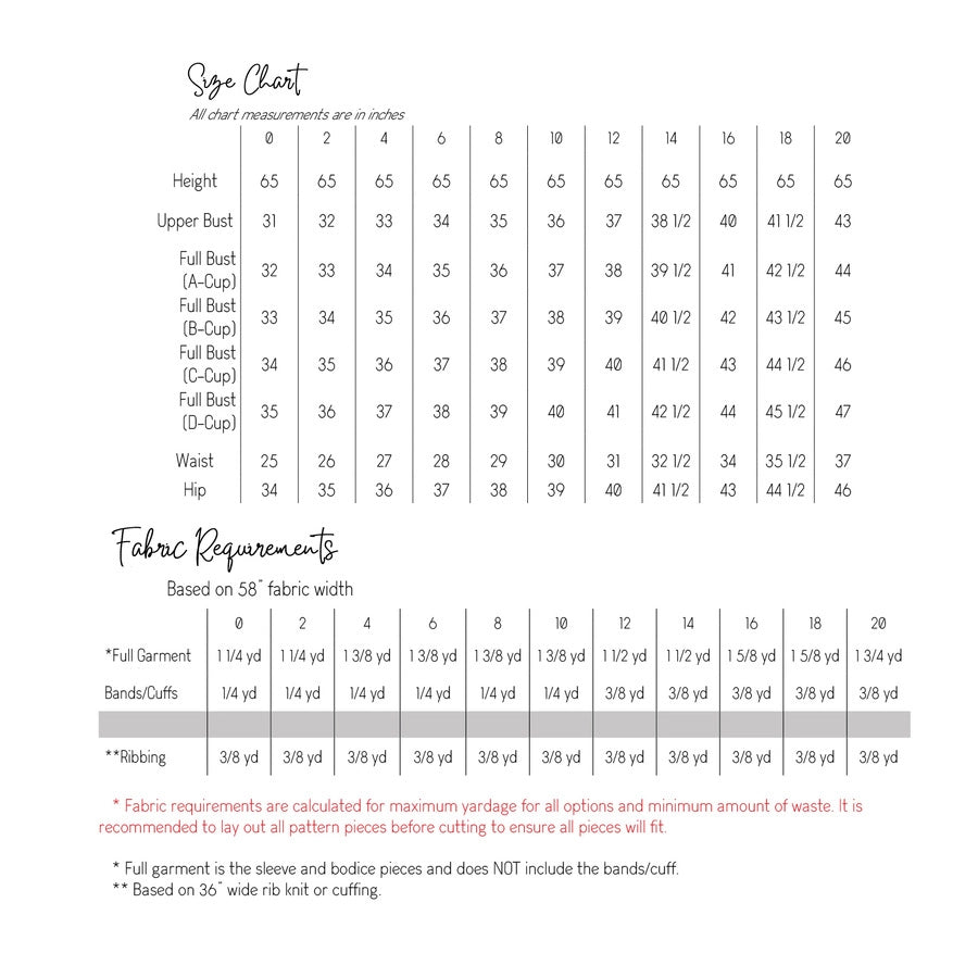 Fabrics: Mid to heavy weight knit fabrics with a minimum 25% stretch such as cotton jersey, french terry, bamboo french terry, stretch velvet, and more. 2-way and 4-way stretch fabrics can be used.