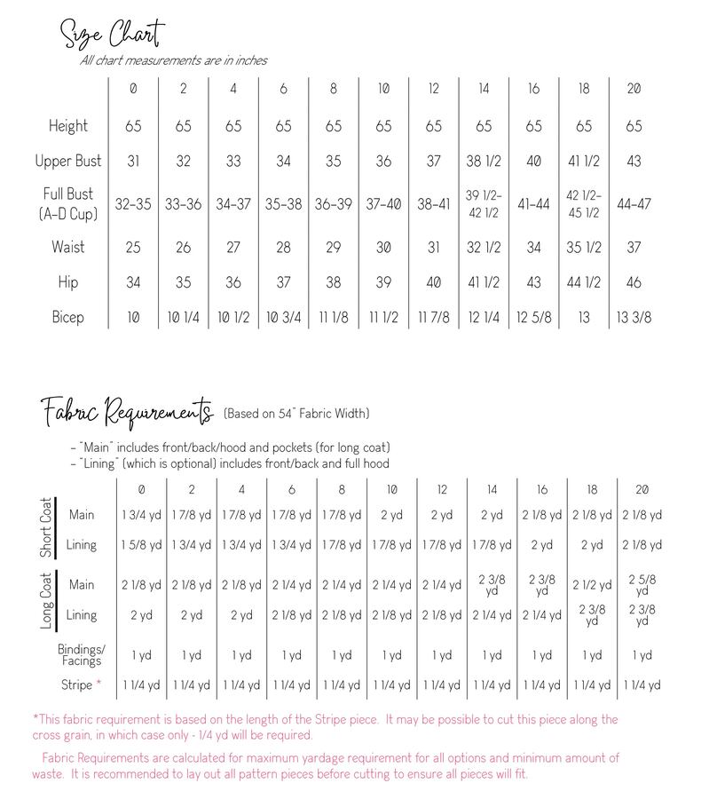 Knit fabrics, by nature, will hang longer than the finished measurements in the chart above. Keep this in mind when using heavier or stretchier fabrics.