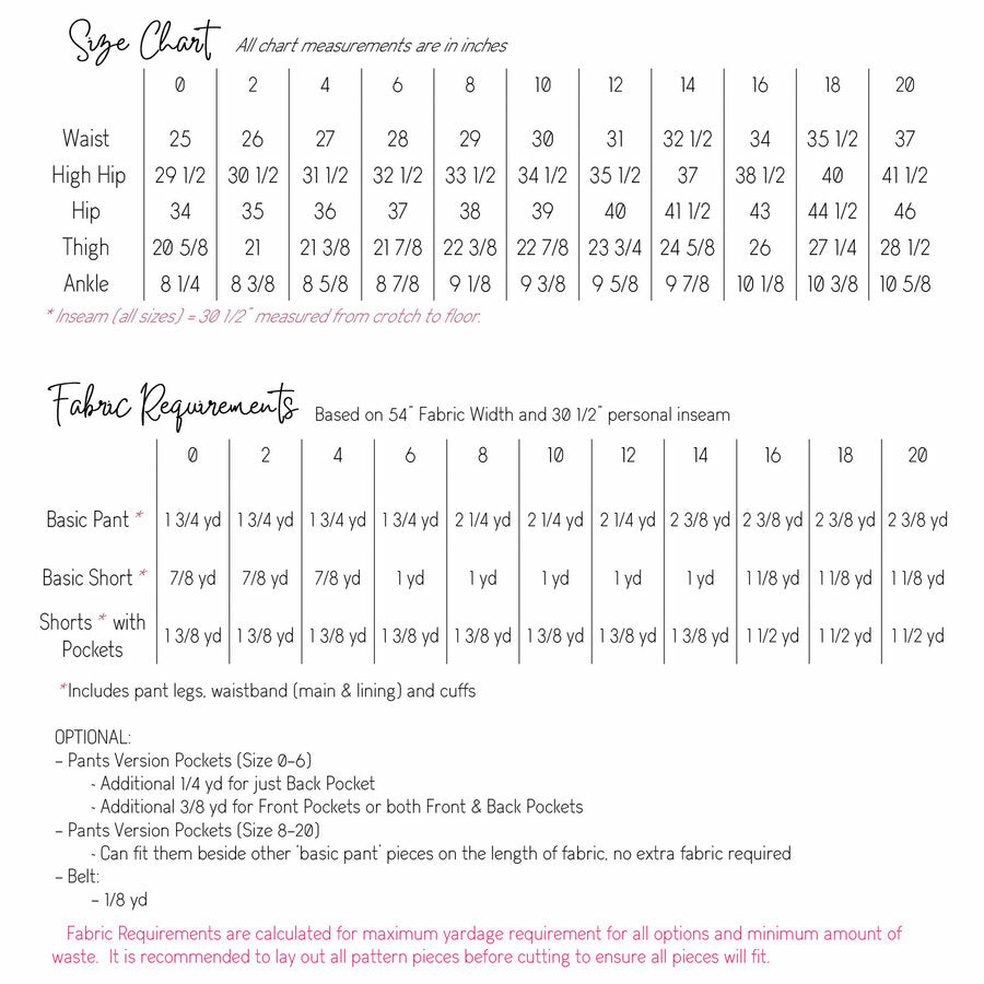Try the pants in a twill or corduroy with the elastic casing for a more structured pant, or grab your favorite mid-weight drapey fabric with the belt and flat front cuff options for a dressier look. At a slightly cropped length the cuffed pants style wonderfully with a pair of heels or a cute ankle boot! The straight leg pant sits just a little longer for a more casual look. As the weather warms try out the shorts which have a 3 1/2” inseam and a quick turned up hem.