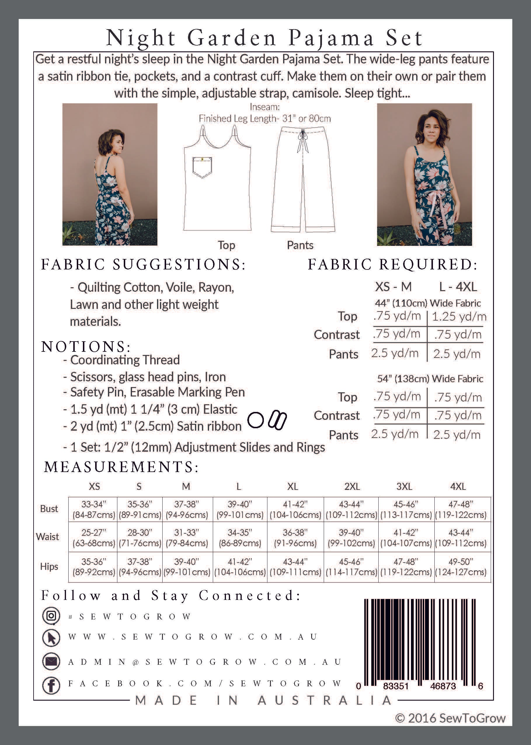 Get a restful night's sleep in the Night Garden Pajama Set. The wide-leg pants feature a satin ribbon tie, pockets, and a contrast cuff. Make them on their own or pair them with the simple, adjustable strap, camisole. This PJ set would sew up beautifully in a quilting weight cotton, or make it in rayon for a completely luxurious feel! Sleep tight...
