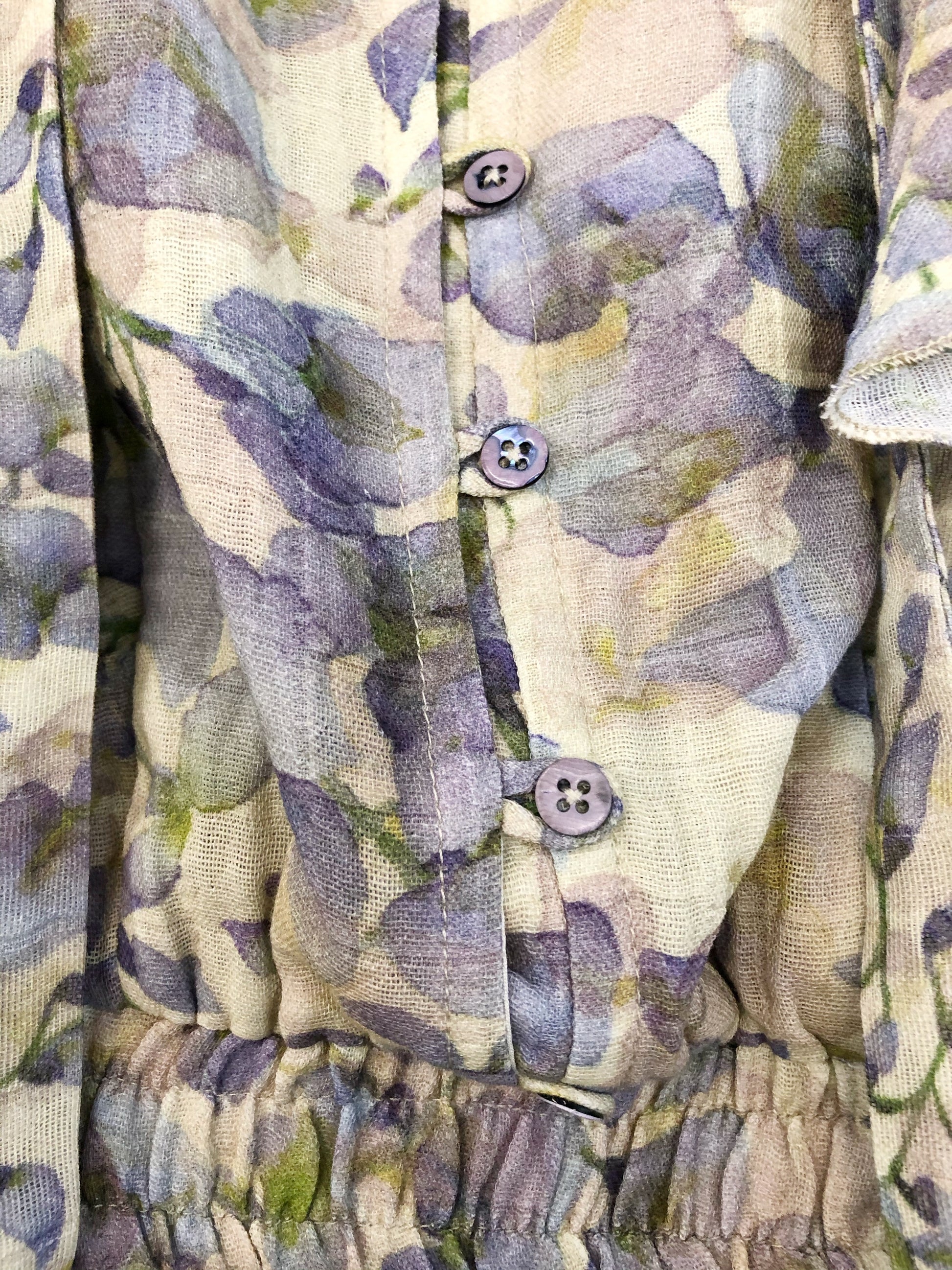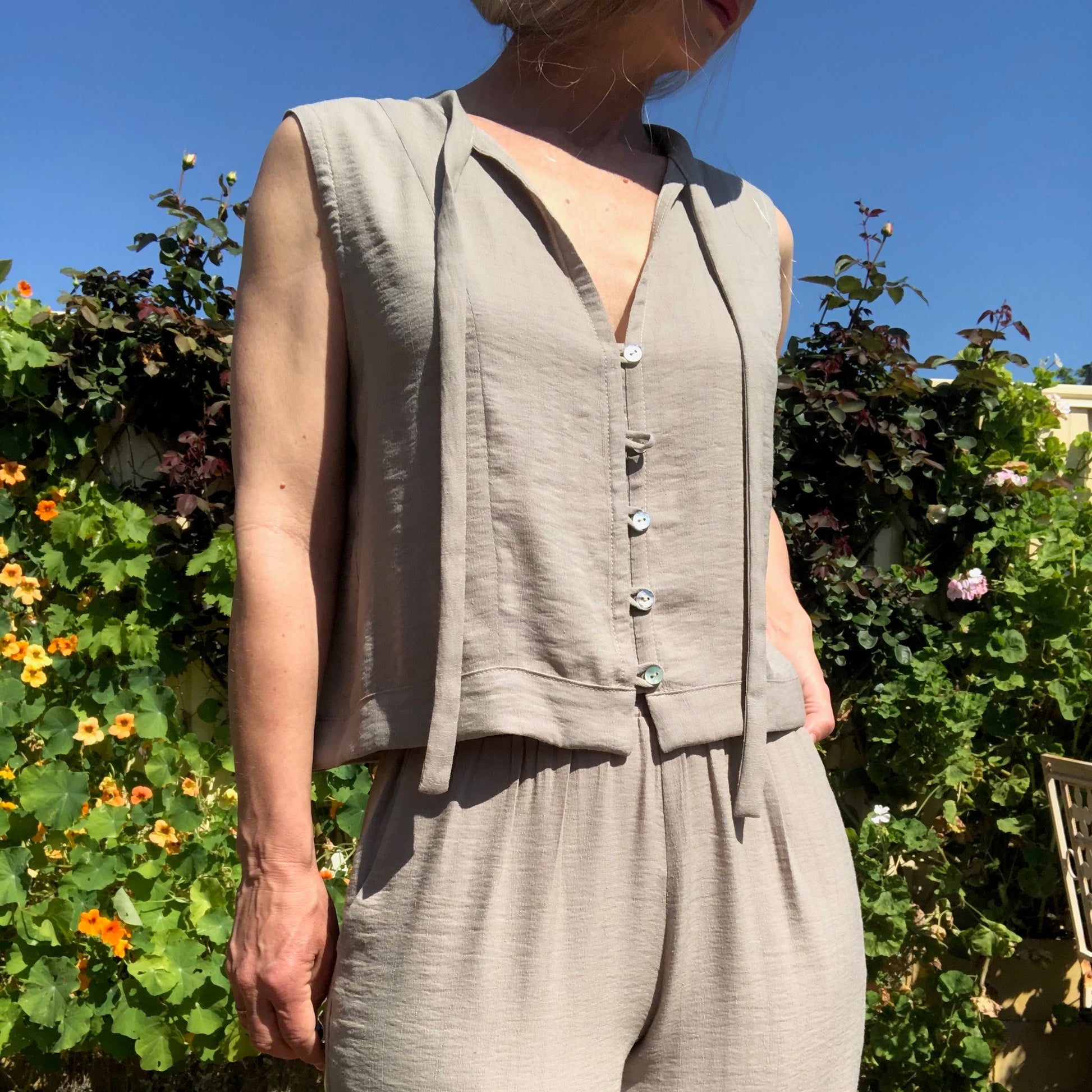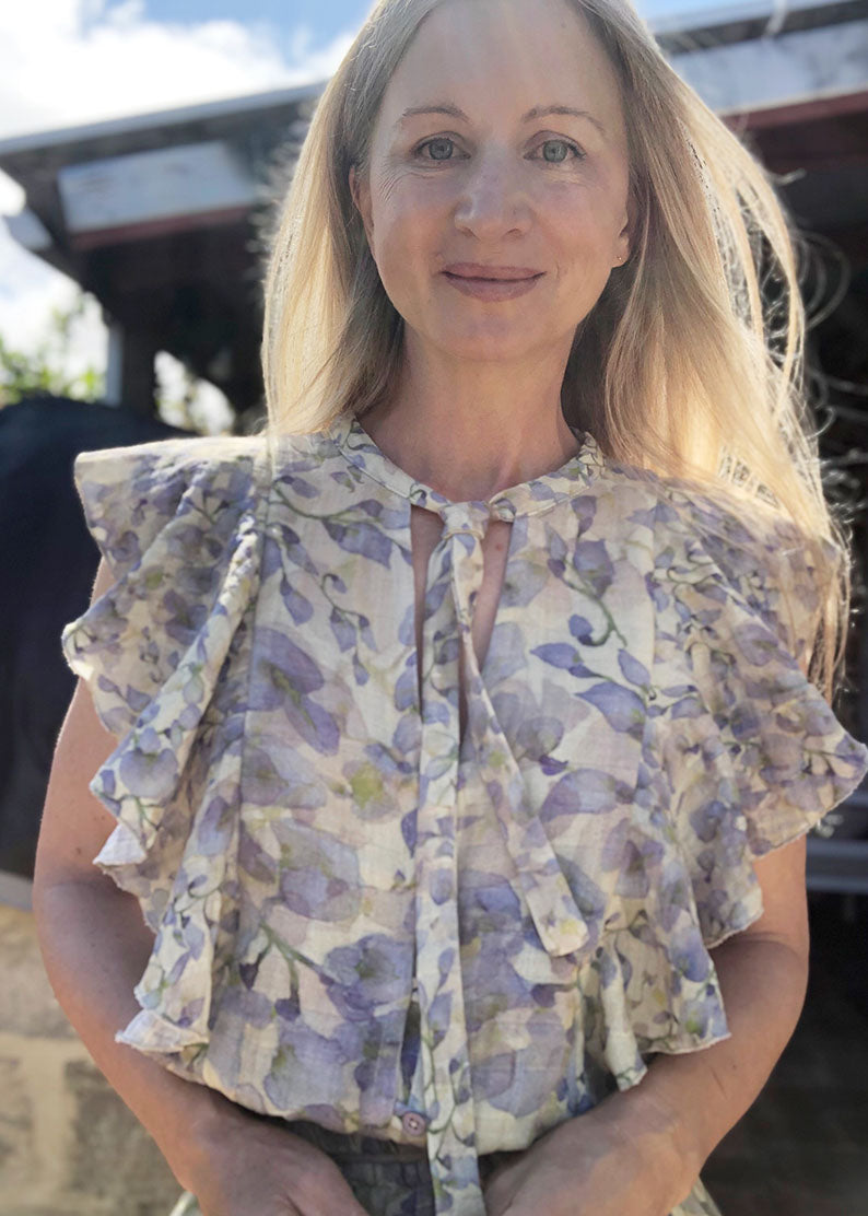 The blouse features either an elasticated waistband or open front waistband, front opening with rouleau loops and buttons and neckties. The top can be made with or without the flounce.
