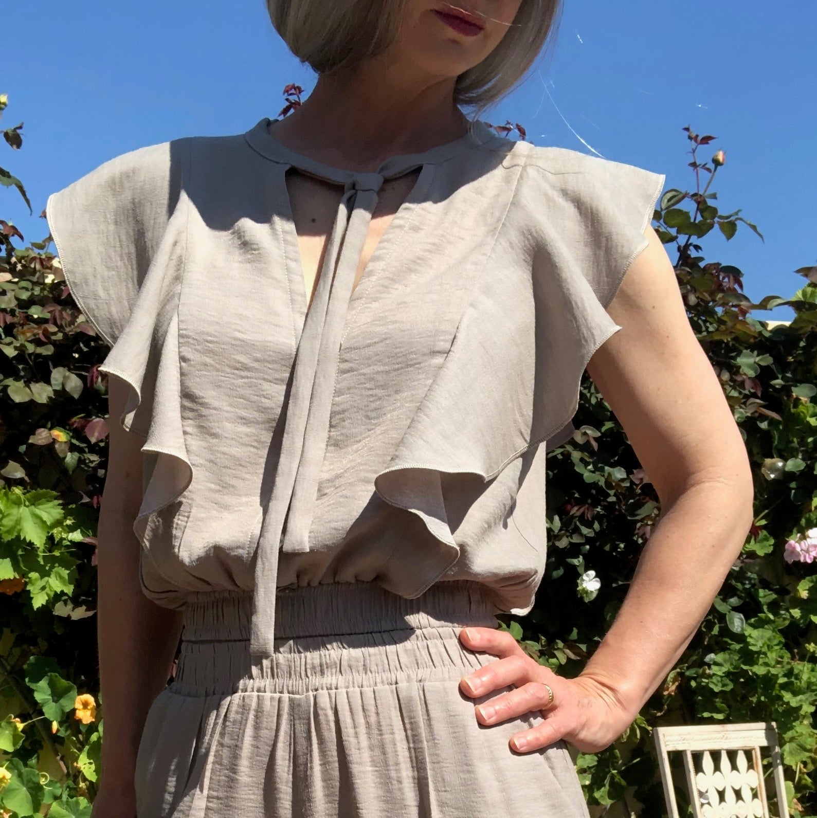Phoebe Flounce is an add-on in the Phoebe Collection. It can be made as a top on its own or combined with any of the Phoebe Bottoms to make a dress.