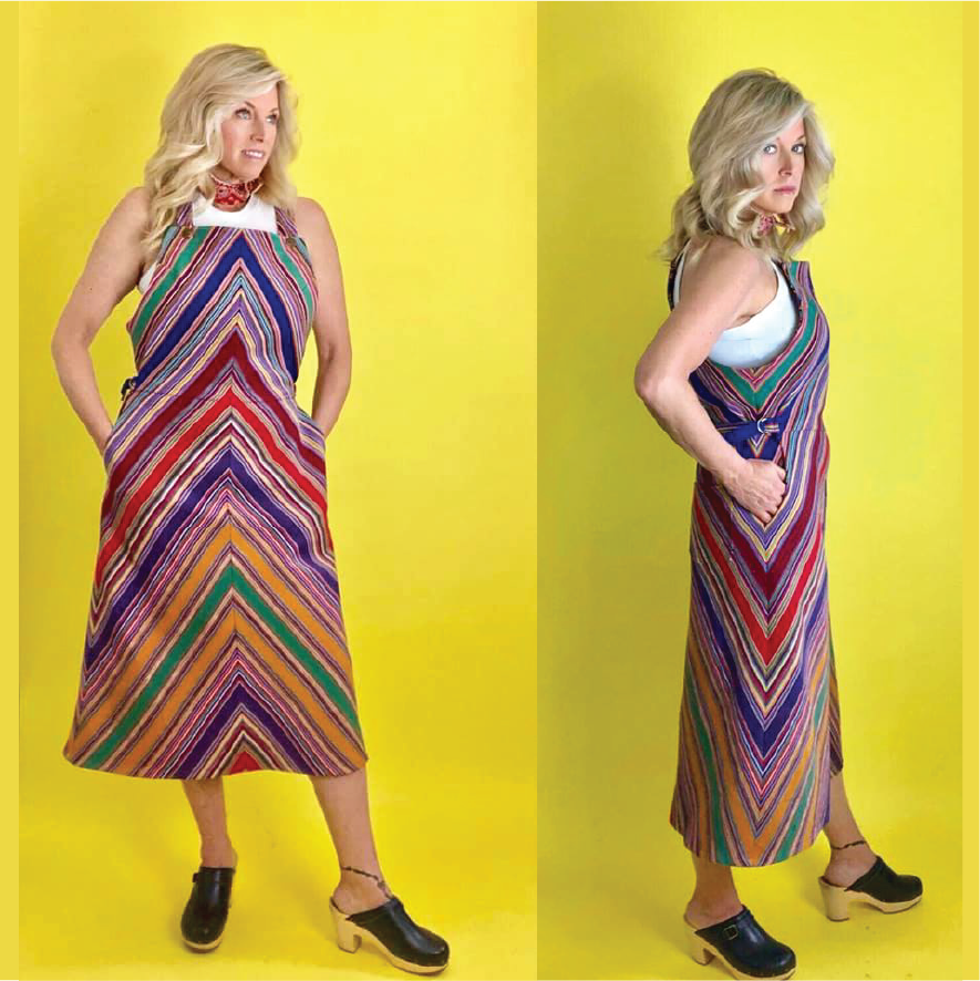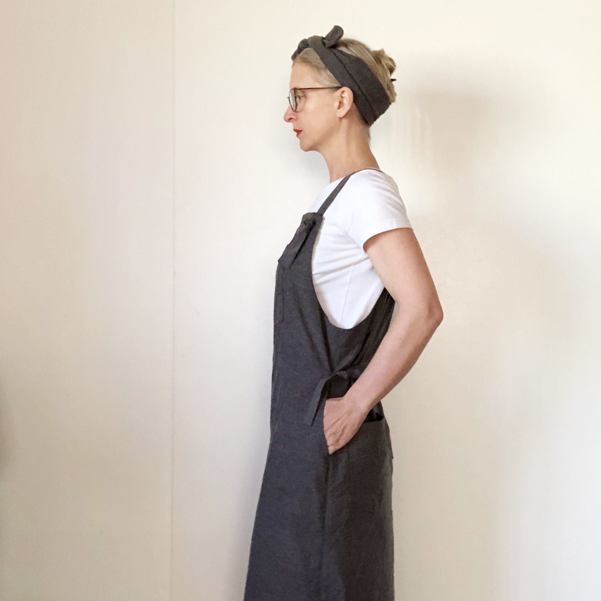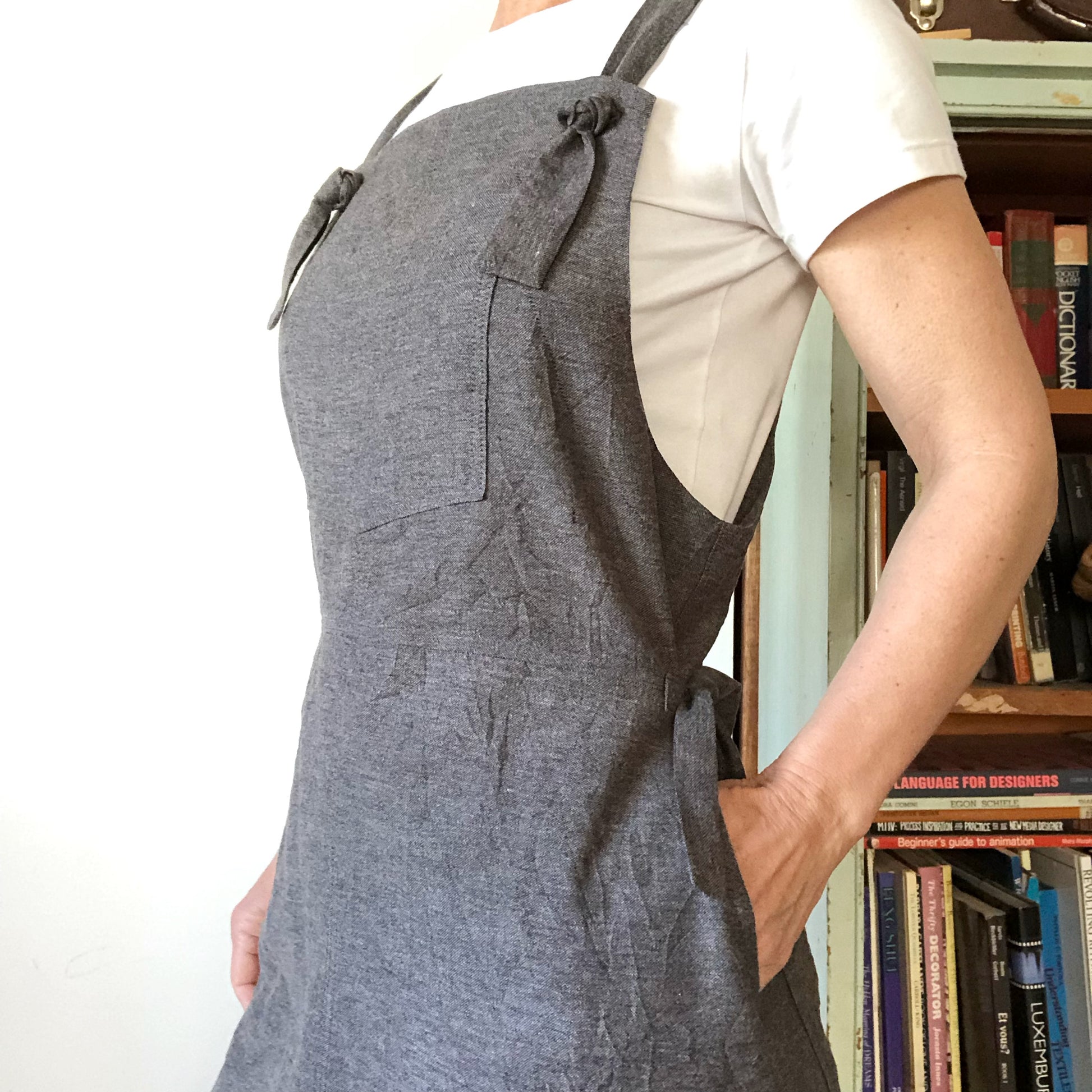 Pinny version of the Phoebe Bib & Tucker. Features centre front and back seams, bib pocket, front pockets and back pockets. Strap and ties can fasten by being knotted or adapted.