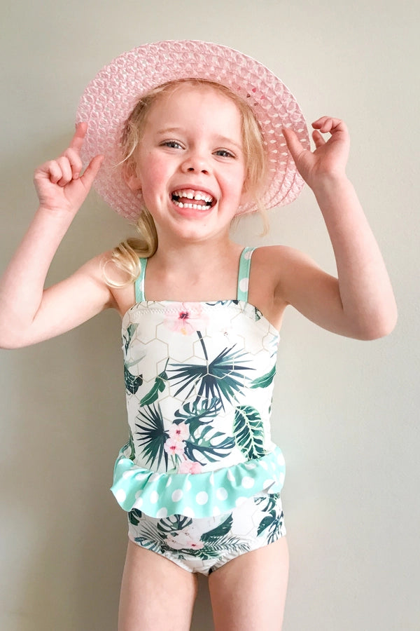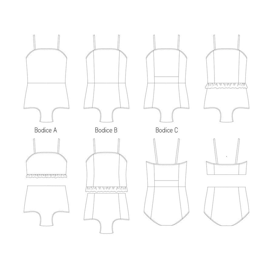 This vintage style swimsuit pattern comes with a variety of options for one or two piece suits. With pieced or solid options for the bodice and bottoms, it can be a very simple suit or great for colour blocking. The one piece suit has an extra insert for even more colour-blocking fun. An optional ruffle can be sewn into the waist of a one piece or at the hem of the two piece bodice. The two piece bodice can be cut at a cropped or tankini length. Make a Raspberry cover-up to complete this cute beach look.