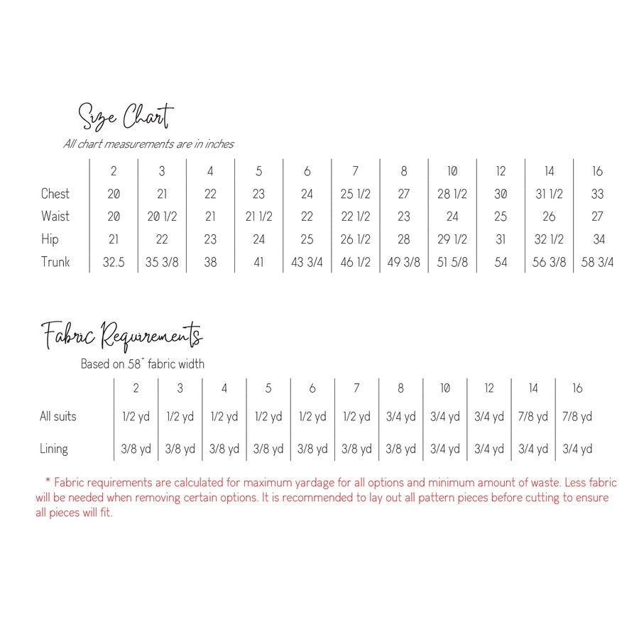 Fabrics: Swim fabrics with minimum 50-70% stretch. Athletic knits can be used, but may wear out sooner from sun and chlorine exposure. Swim fabrics with high recovery and lower stretch percentage will result in a suit that feels tighter.