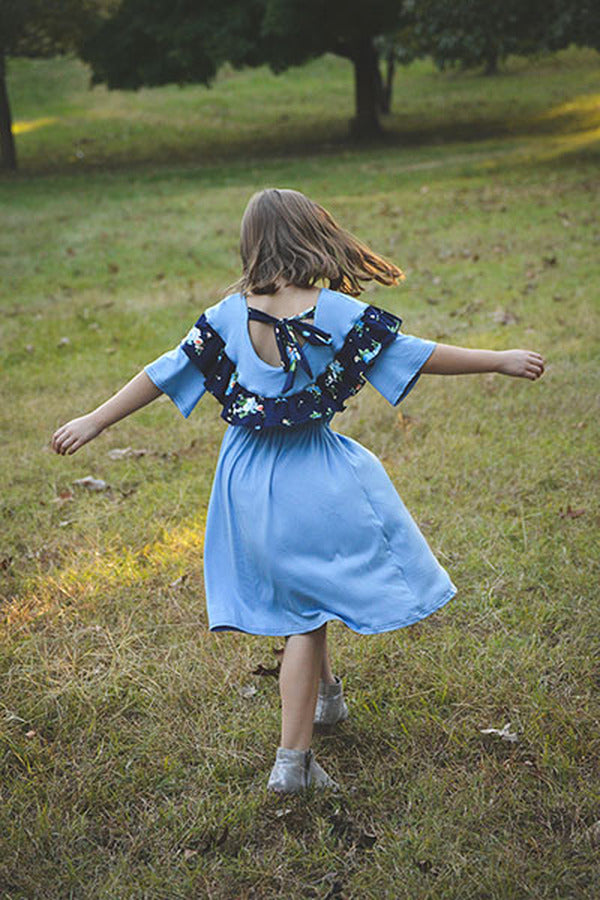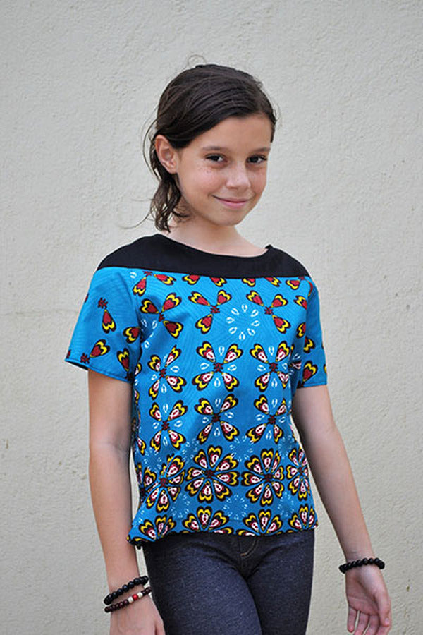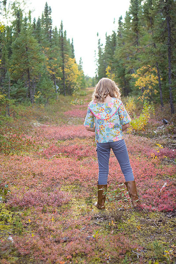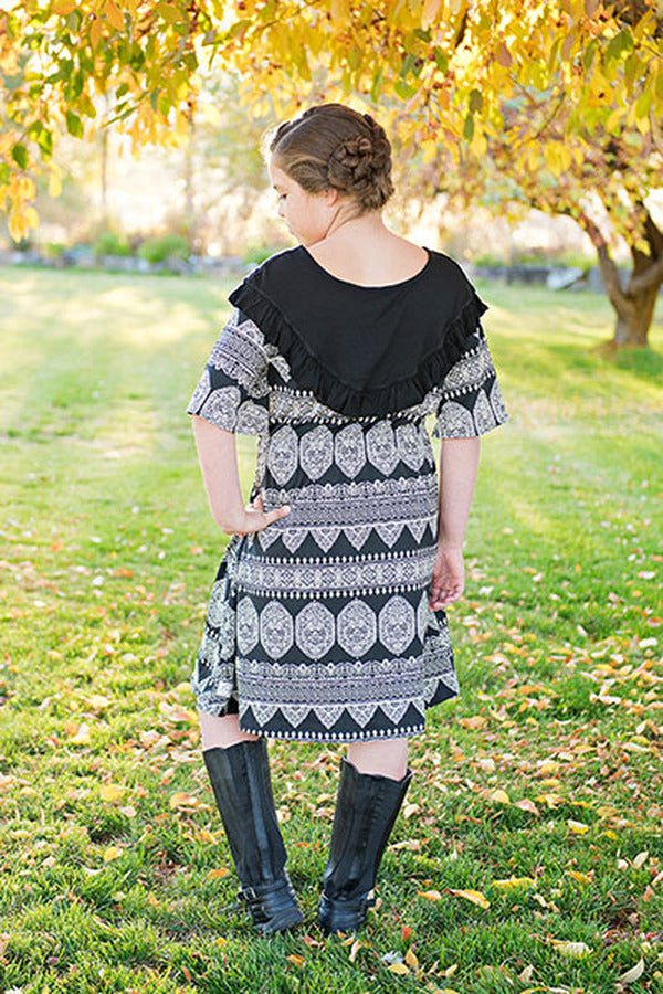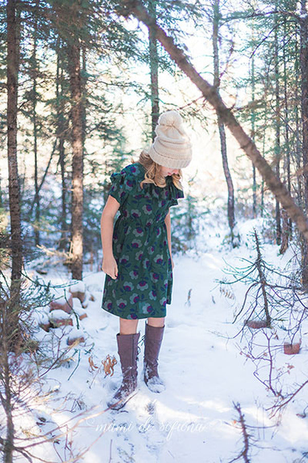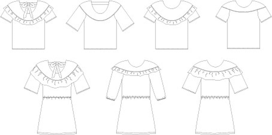 The Raven is a dress or shirt with a dropped shoulder and scoop back that is both trendy and suitable for comfortable everyday wear. Add a short or long ruffle or leave it simple. Make a top with split hem or a dress with elastic waist for easy pull on. There are three sleeve options and an optional tie around the waist for a belted look. For the back, choose a simple band, ties or a raised scoop. This pattern is recommended for woven fabrics, however the dress can be made with lightweight knits as well.