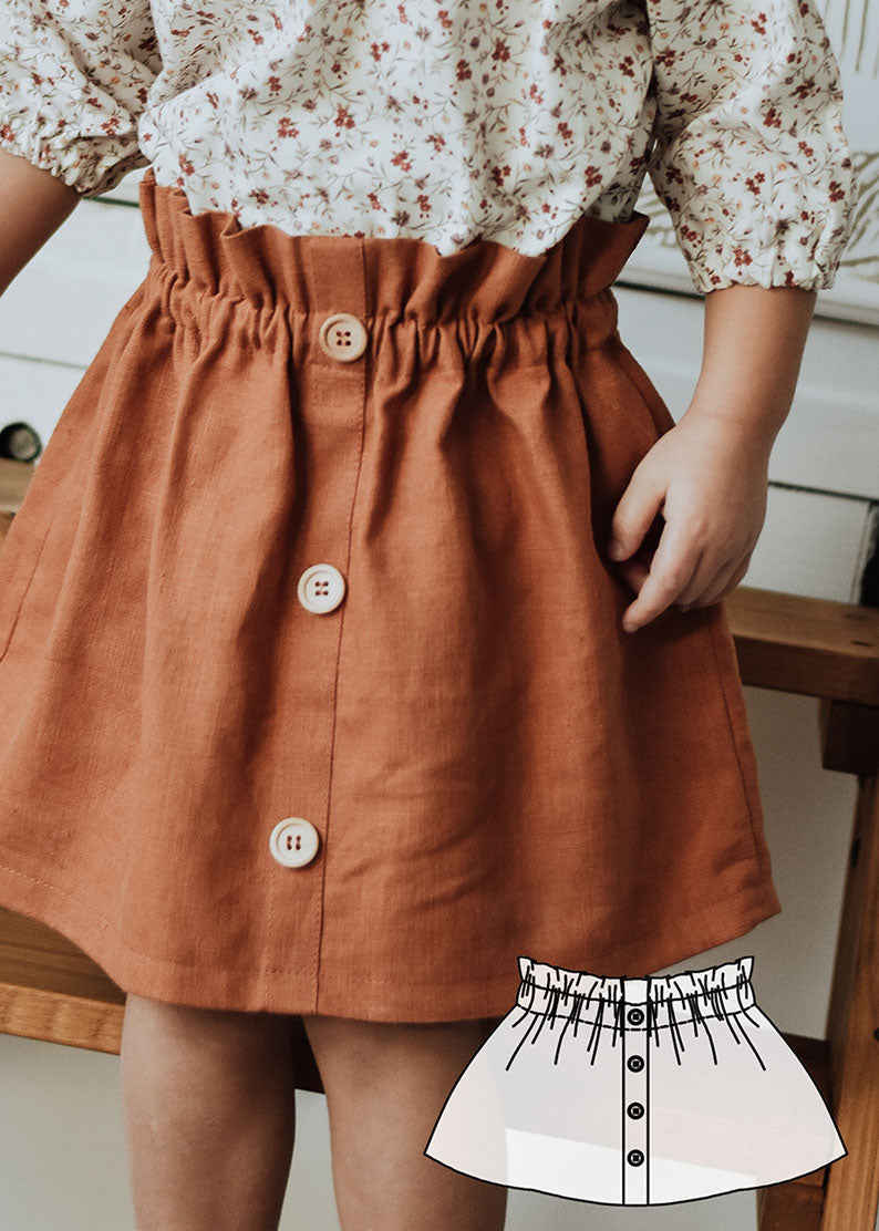 Remi is a sweet and simple skirt featuring a paper bag waist and faux placket. It's such a classic style you and your little girl will love!
