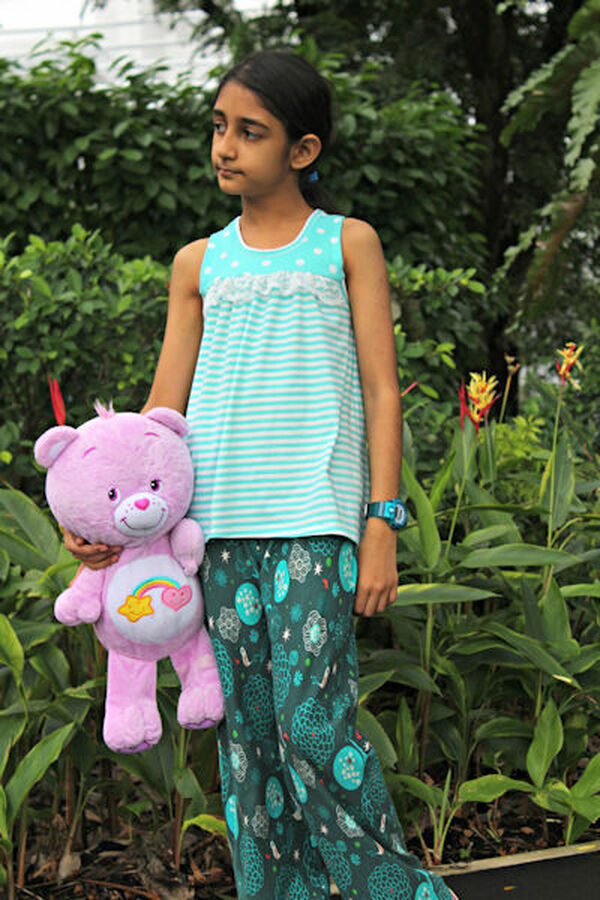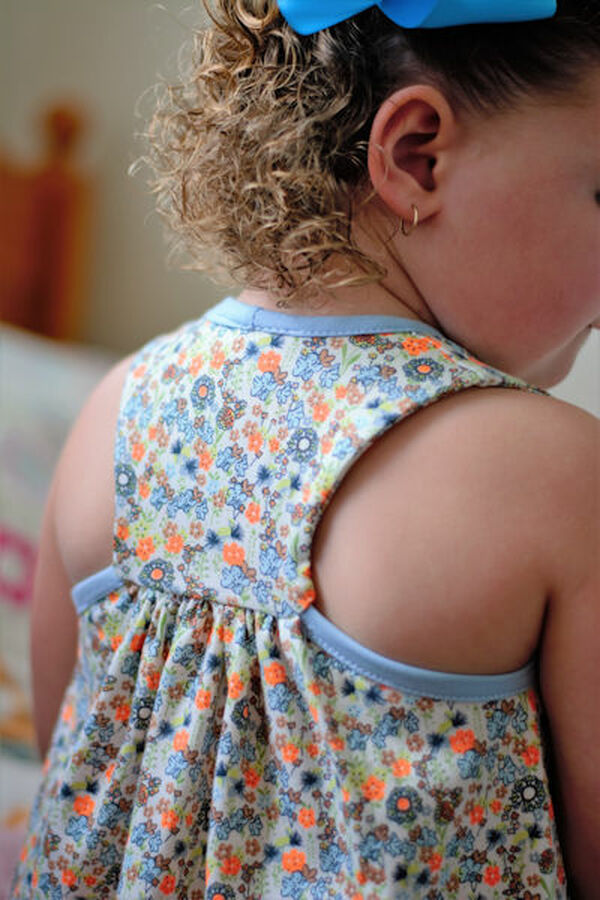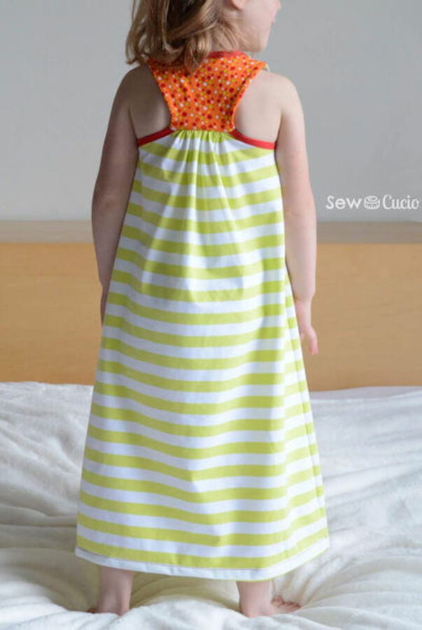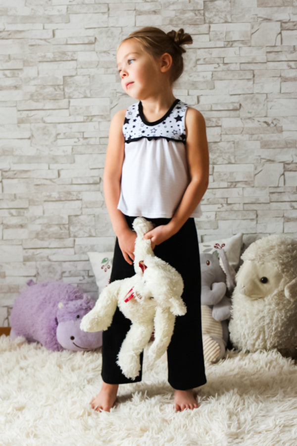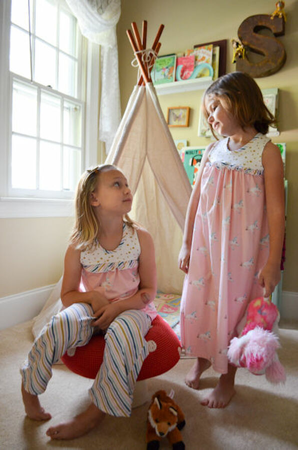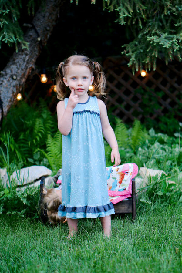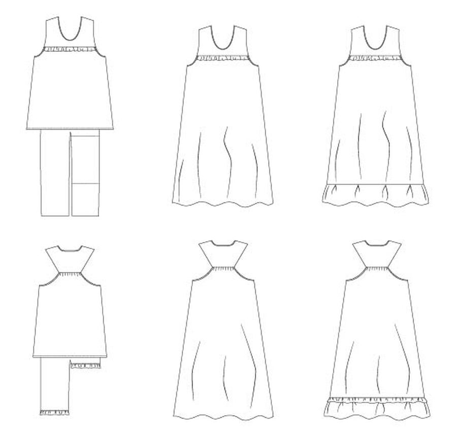 The Starry Night pattern is a knit PJ featuring a racer back style top. Options include nightgown, ruffle bottom nightgown or top. Also included are basic PJ pants in full, capri and short length with optional ruffle hem for the capri and shorts. This pattern is also available in a bundle with the Arctic Fox housecoat.