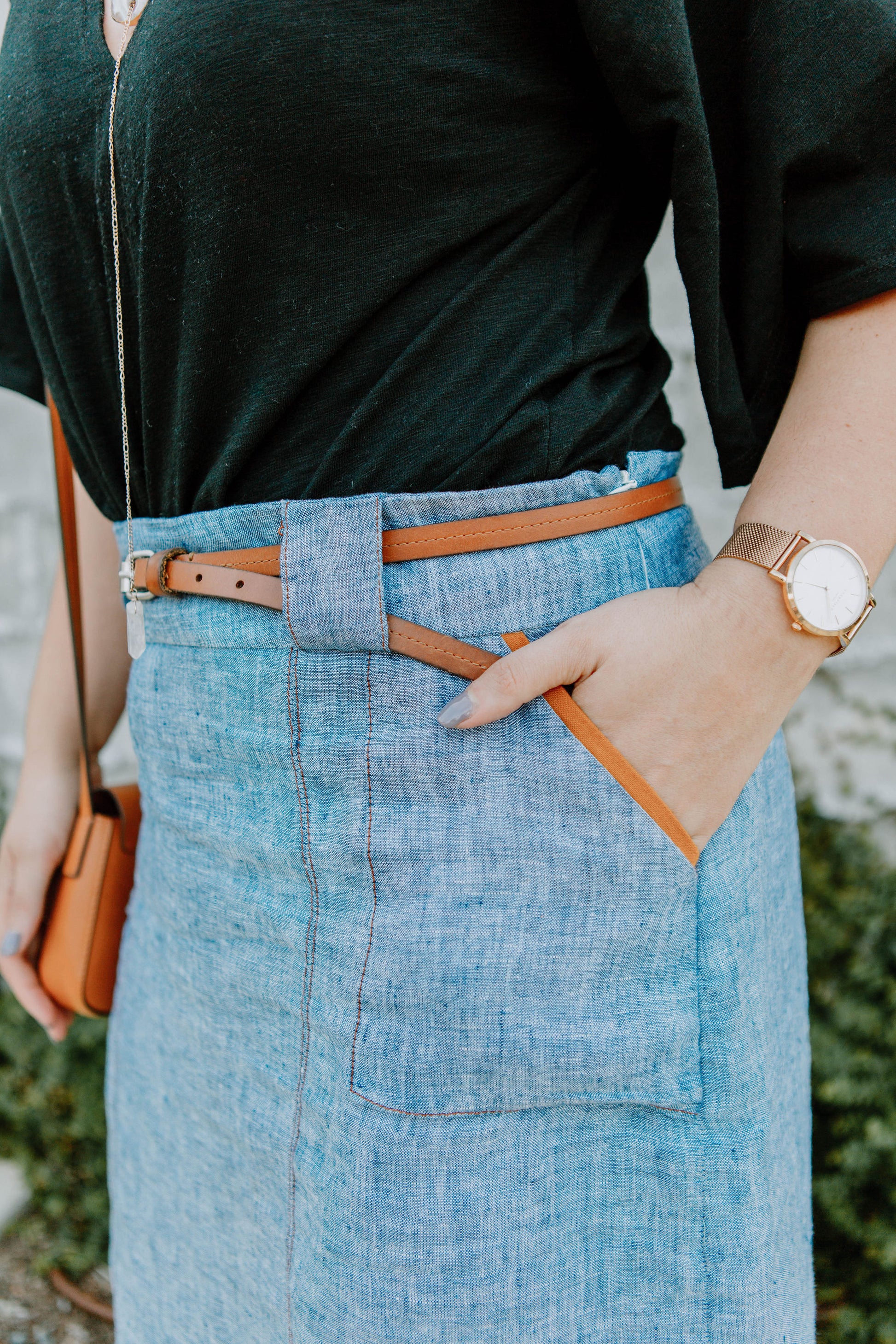 Inspired by the effortlessly chic styles of the 1960's, the Stella Skirt features exposed topstitched pockets, chunky belt loops, and a thick hem for an added retro flare. Mix and Match your prints to create a whole new look or keep it clean and simple with a stone washed linen or thick wale cord.