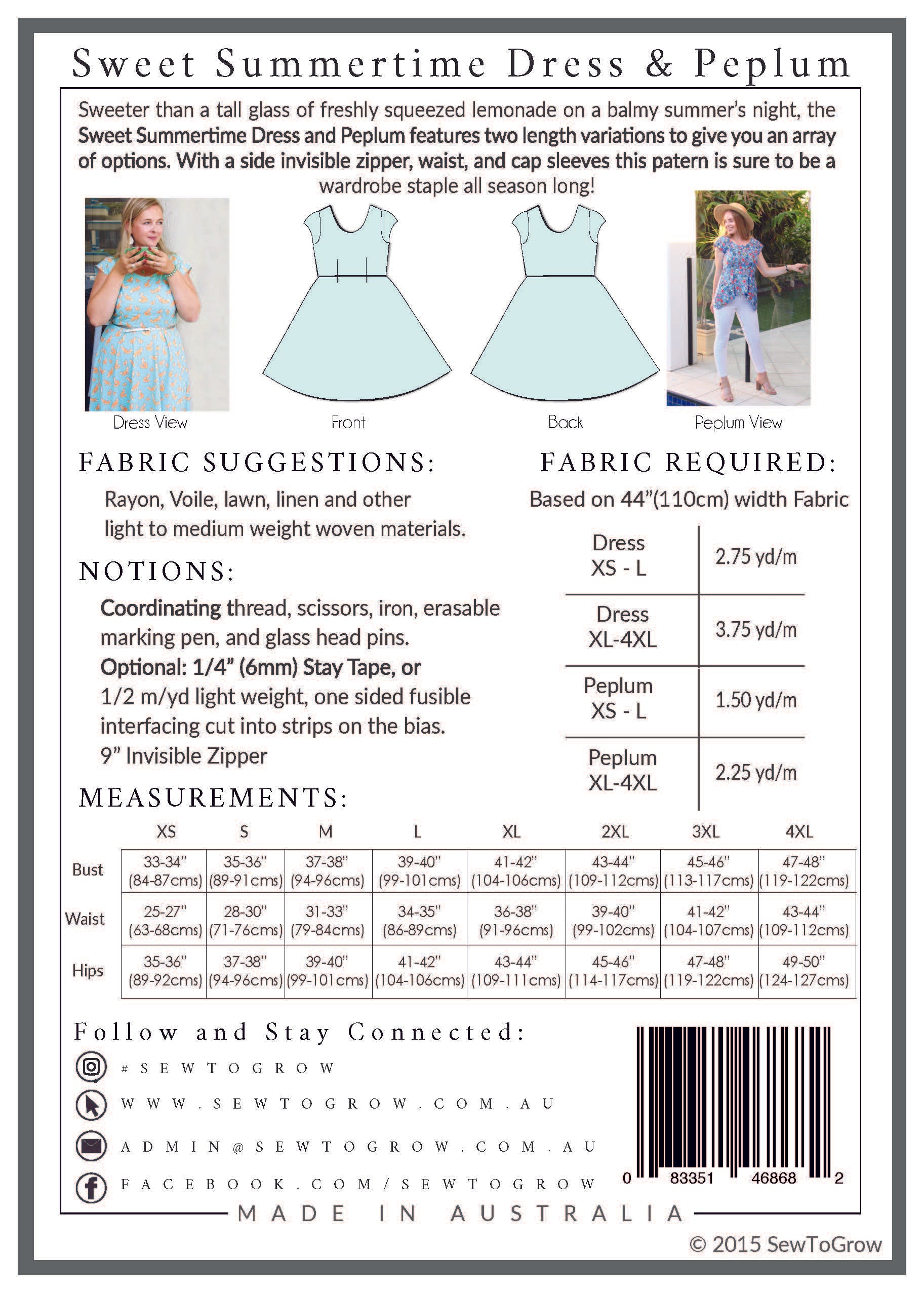 Sweeter than a tall glass of freshly squeezed lemonade on a balmy summer’s night, the Sweet Summertime Peplum and Dress features two length variations to give you an array of options. With no zippers, a fitted waist, and cap sleeves this pattern is sure to be a wardrobe staple all season long!