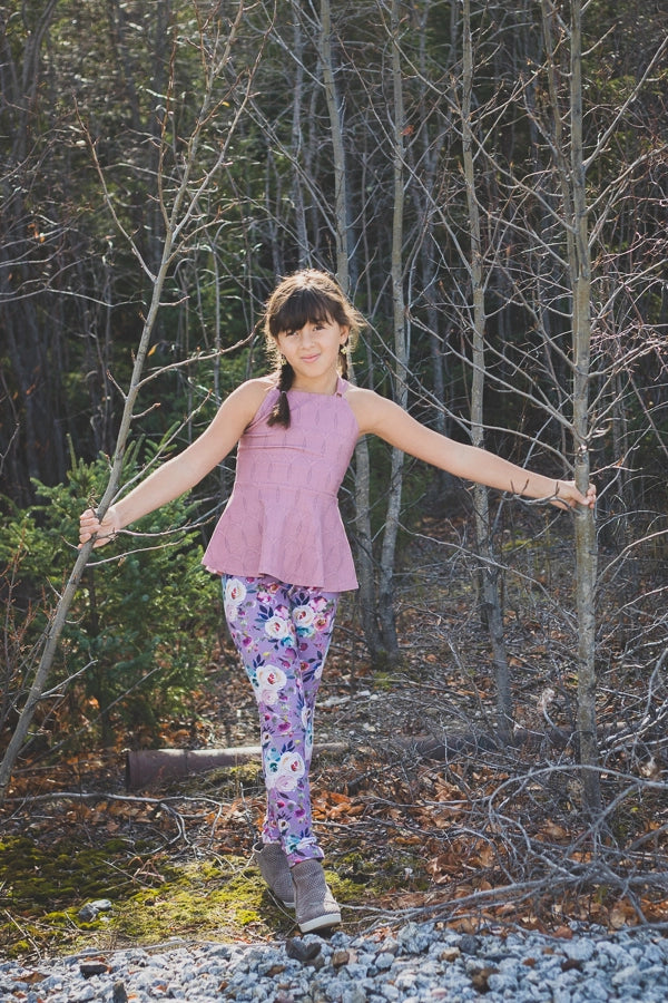 The Tide features a fun and trendy dress with an “overalls” style halter strap. It is designed for knit fabrics and comes with both a half circle skirt for a sleek, modern look and a full circle option for the girls that love to twirl. Both skirt widths are available in peplum and knee lengths. It pairs perfectly with a cropped Tundra sweater for a cooler weather look and a pair of Rocky Shore tights when choosing the peplum length.