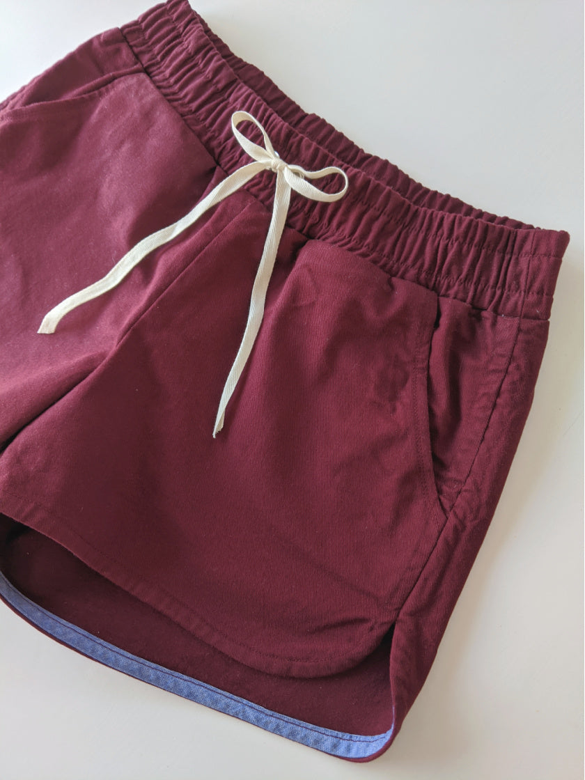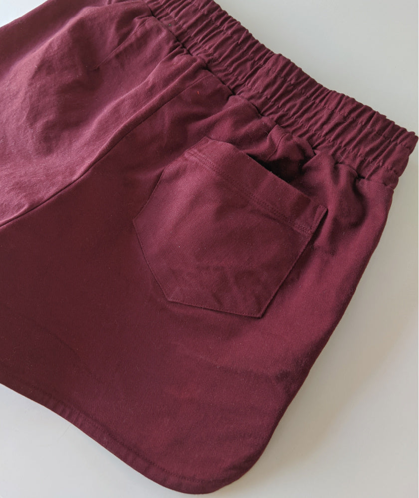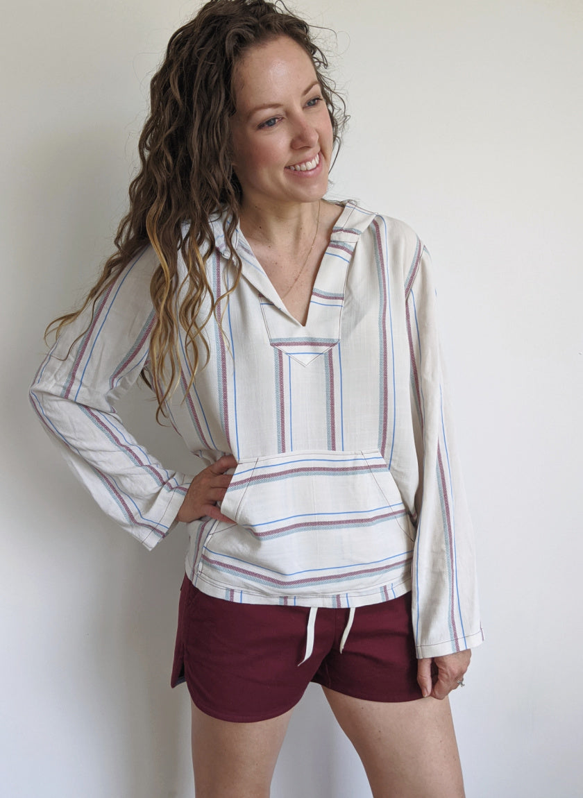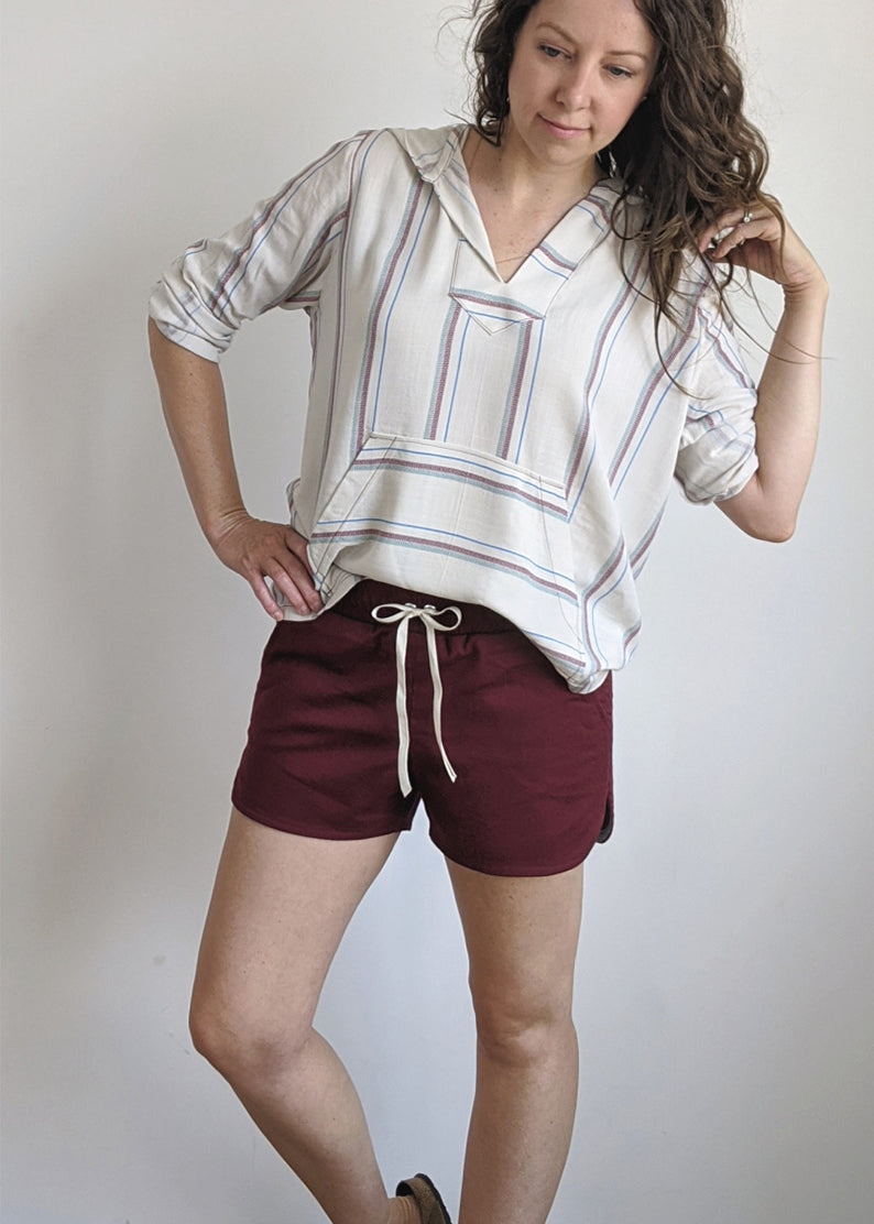 The Vero Beach set is a casual, easy-fit outfit with two pieces. The top is a Baja-style hoodie with a large kangaroo pocket, wide sleeves, and a slightly cropped hem. The shorts are fitted through the hip with a full elasticated waistband, back darts to reduce gathering bulk, a low to mid front rise, and options for eyelets and drawstring in the waistband, front slash pockets, and a back patch pocket. Vero Beach is perfect for layering over a bathing suit for sun protection or throwing on over a tank when the Summer nights cool down.