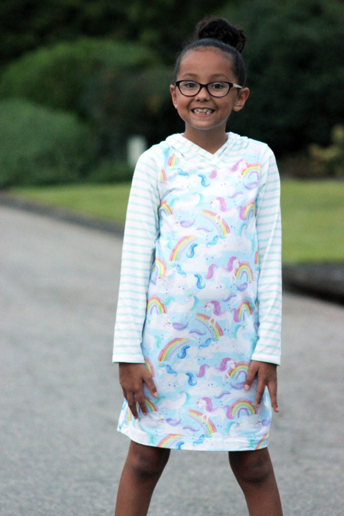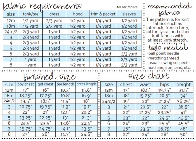 Choose a tee or dress, short or long sleeves, and pocket or no pocket for the Wasabi that’s just right for you! The boy pattern pieces are drafted separately from the girls for a better fit and are 1″ longer. The girls pieces have slight shaping to the side seams for a more feminine touch.